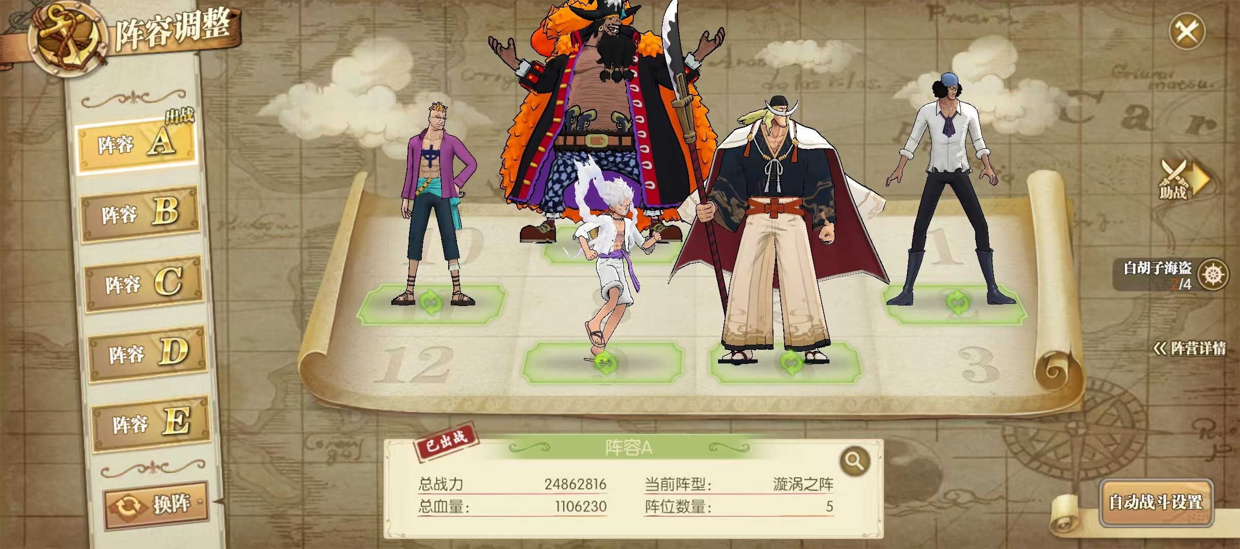 这三个阵容都有各自的优势,所以大家看看自己有哪些人物自己上吧,老王就不多说了!主要说的是加速为尽可能给黑胡子和尼卡站,白胡子站第二行,第一行的嗝屁之后白胡子扛伤害,后面内战主要还是看尼卡速度,又回到了拼尼卡的版本了!