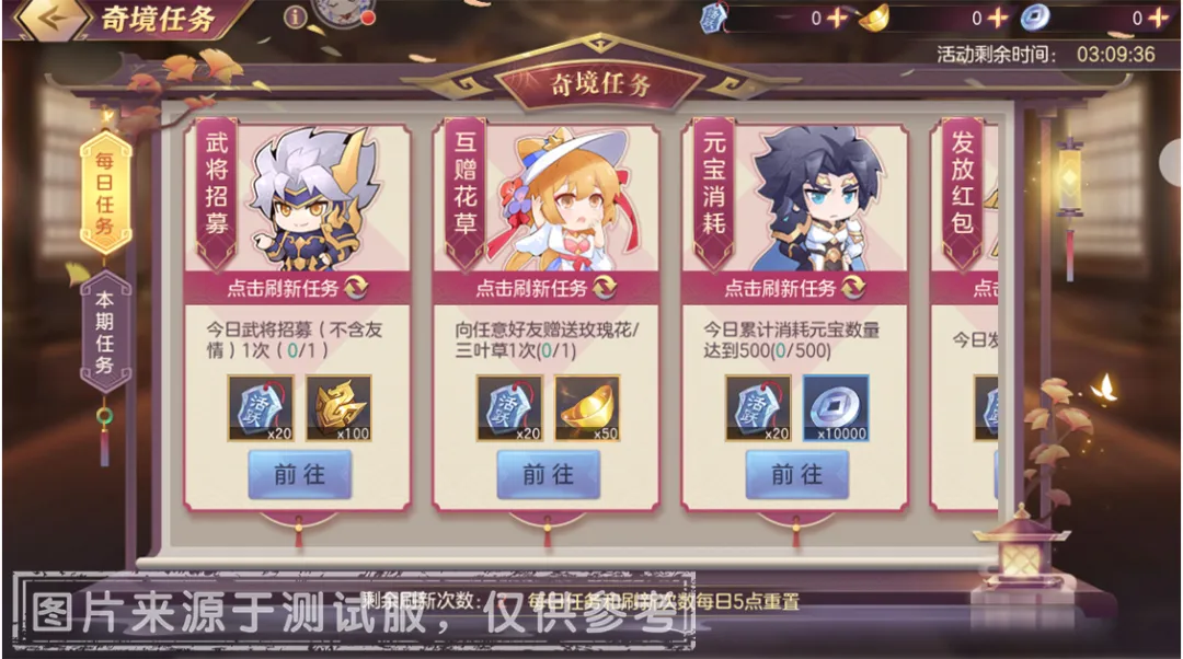 1、活动期间,小将军们在【奇境任务】活动界面,可分别领取【每日任务】和【本期任务】,完成任务即可获得关卡凭证「活跃勋章」和「元宝、荣誉勋章、功勋」等随机奖励!
