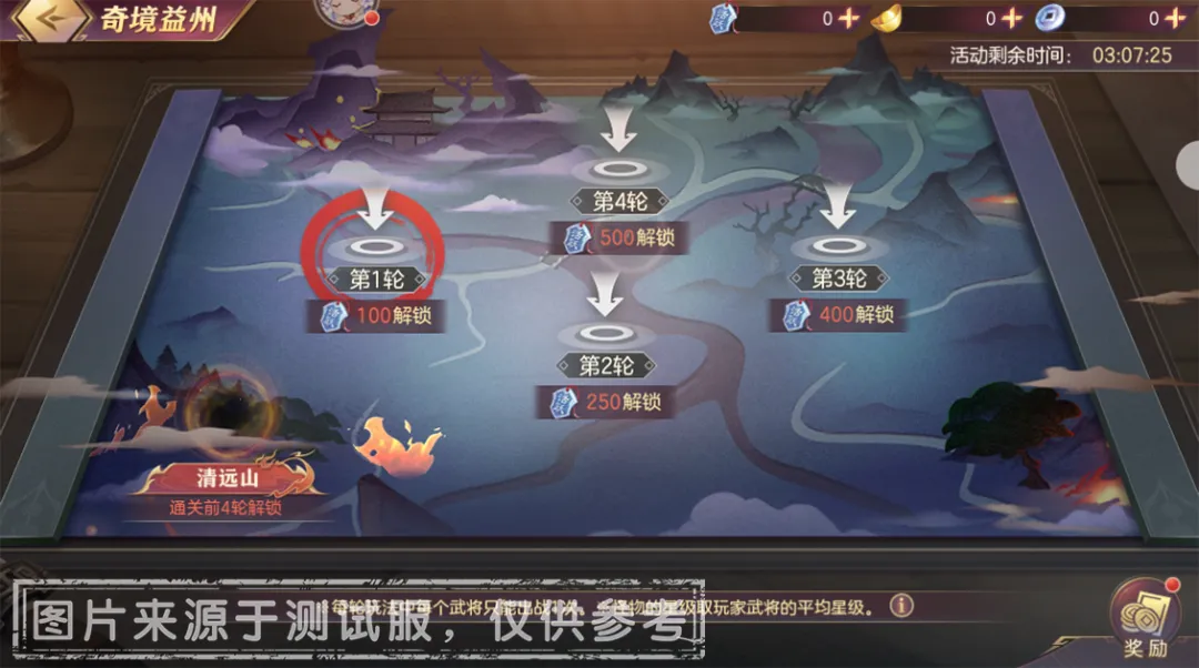 2、在本次「奇境益州」的主题中,小将军们共可进行5轮的战斗挑战,第1~4轮在「活跃勋章」累计获取至指定数量时解锁,第5轮【清远山】关卡将于前4轮通关后解锁。