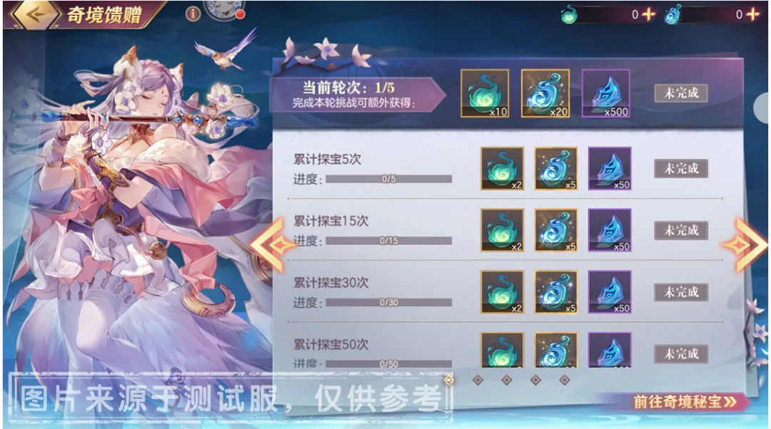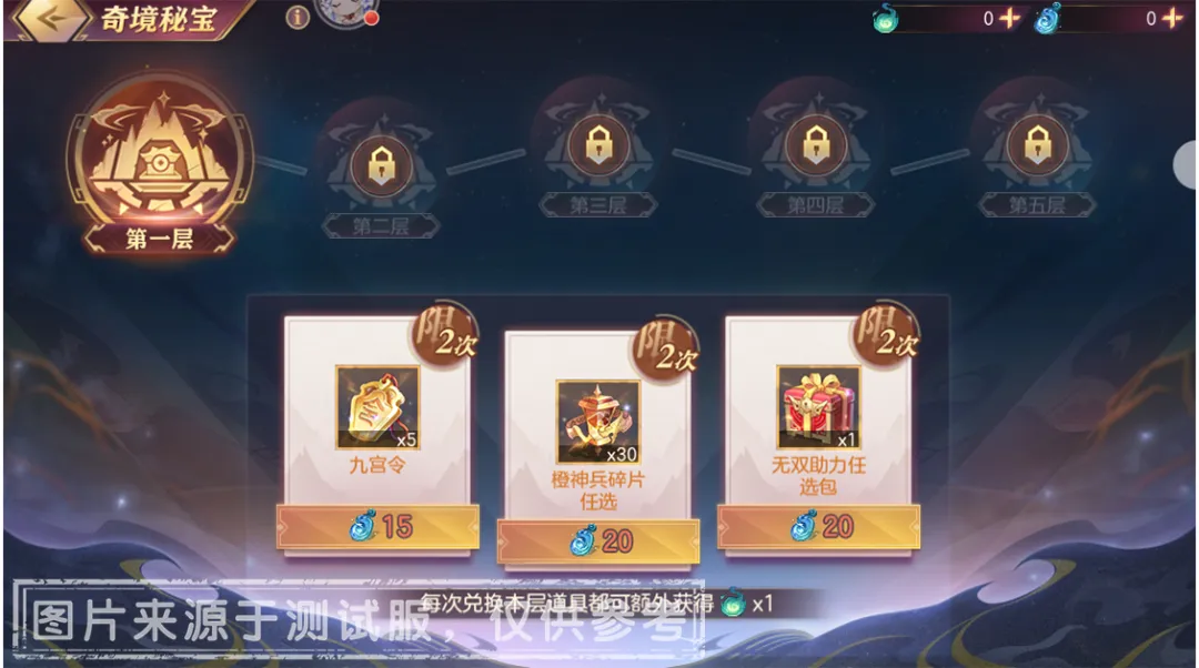 2、「奇境宝玉」可用于兑换一共五层【奇境秘宝】,每层中至少完成1次低层秘宝兑换,方可解锁高层秘宝。每次完成秘宝兑换,亦会根据宝物层级返还部分「奇境灵气」。
