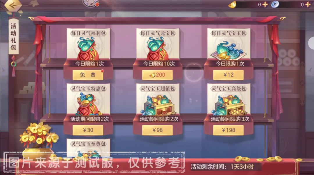 3、每日灵气宝玉包:含元宝*120,奇境灵气*5,奇境宝玉*5,售价12元,活动期间每日可购买1次。
