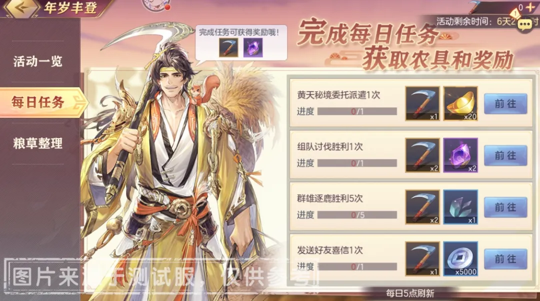 活动期间,完成指定的每日任务可获取「丰登农具、无华命魂石、百炼石」等奖励,每日任务将于每日5点刷新~