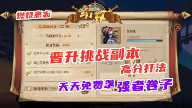想高分,就靠大家如何把控伤害:这里教不了,只能意会。不过这里的排名是按14天周期排名结算,所以基本很多人不怎么追求高分,并奖励为一张卷子,怎么感觉还是2个金魂比较香一点。玩家们基本想最后两三天才认真打打,既然晋升副本就是让平民玩家能获得一半的重要的晋升材料,主要以兑换晋升副本材料为主。分数其次,祝大家拿到一个好的成绩!这期晋升副本的分析到这里先了,希望能帮到热爱航海王的小伙伴们。