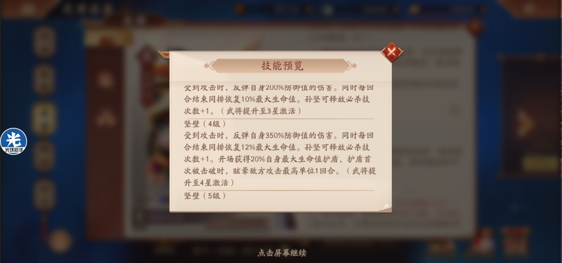 孙坚的怒攻和必杀都可以为所在排增加护盾,注意只有一回合不叠加。四星后孙坚开局自身带护盾