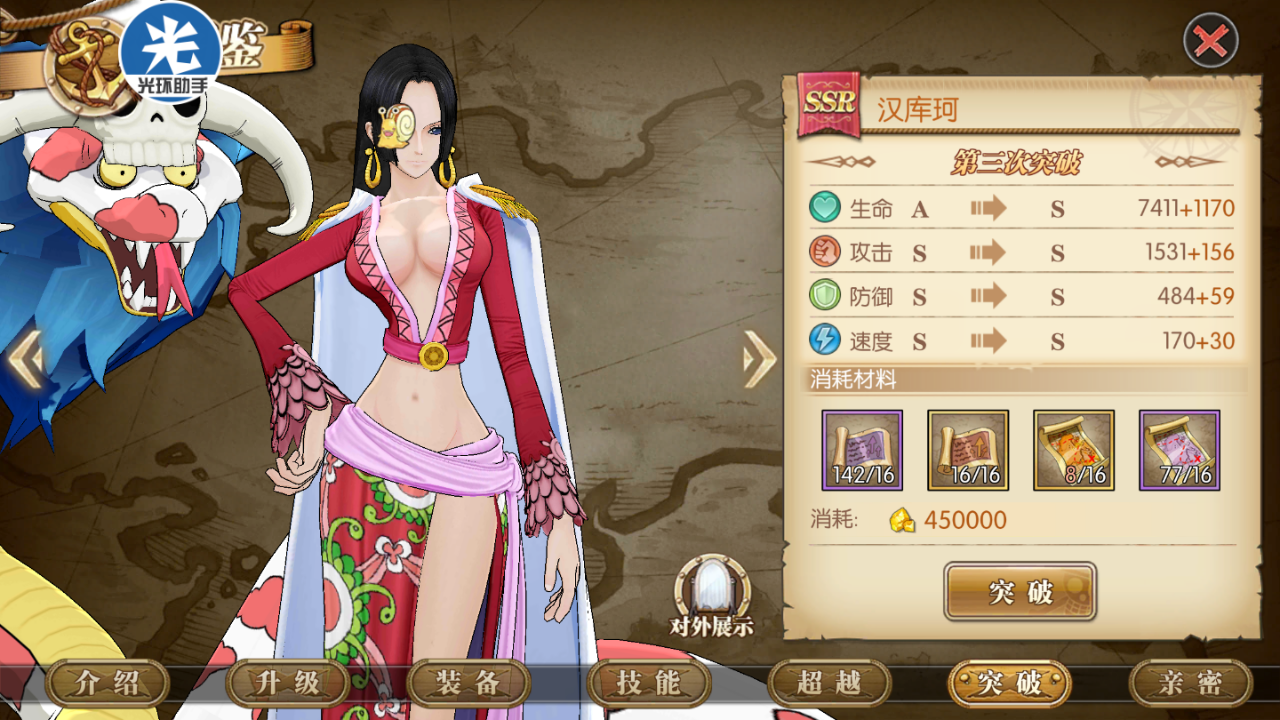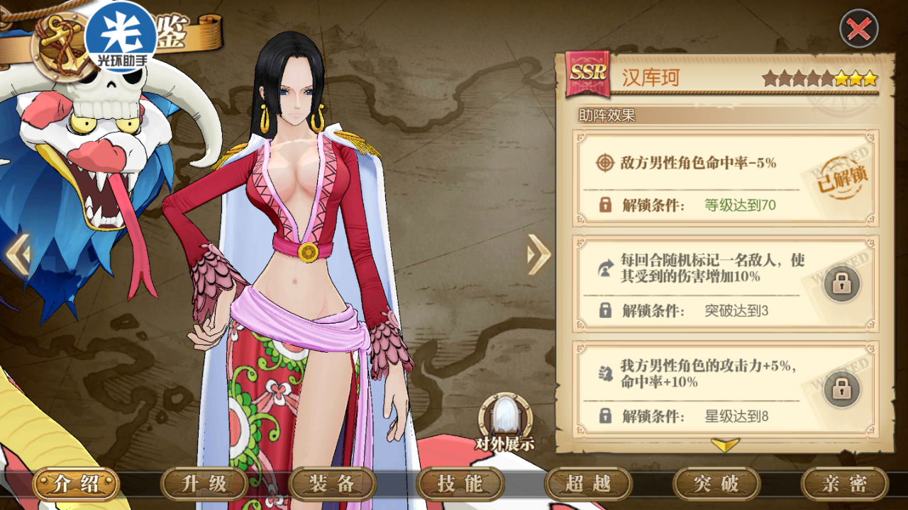 波雅·汉库克,人称:海贼女帝。现任王下七武海的成员之一,也是亚马逊·百合王国的现任女皇帝,同时也是九蛇海贼团的现任船长。官方设定的海贼王世界中的三大顶级绝世美女之一 ,因被世人更为熟知而被称为“世界第一美女”。拥有霸王色霸气、见闻色霸气、武装色霸气。女帝,拥有石化和单体秒人的能力,但由于自身脆弱,导致上场较少。特性:拥有群体和单体石化控制,单体输出极高,能一回合奥义。女帝的输出其实很高,但是比较怕格挡和防御高的角色,打剧情女帝拥有暴击的前提下,输出比黄猿,但由于有跟黄猿一样的脆弱身板,导致上场困难,但由于能一回合奥义,还是有一定使用价值的。目前最大的用处便是助战,增加命中和攻击。缺点:身板过脆,而且目前石化也没有发挥的作用,主要的3大输出,小马哥,雷利,白胡子都免疫石化。