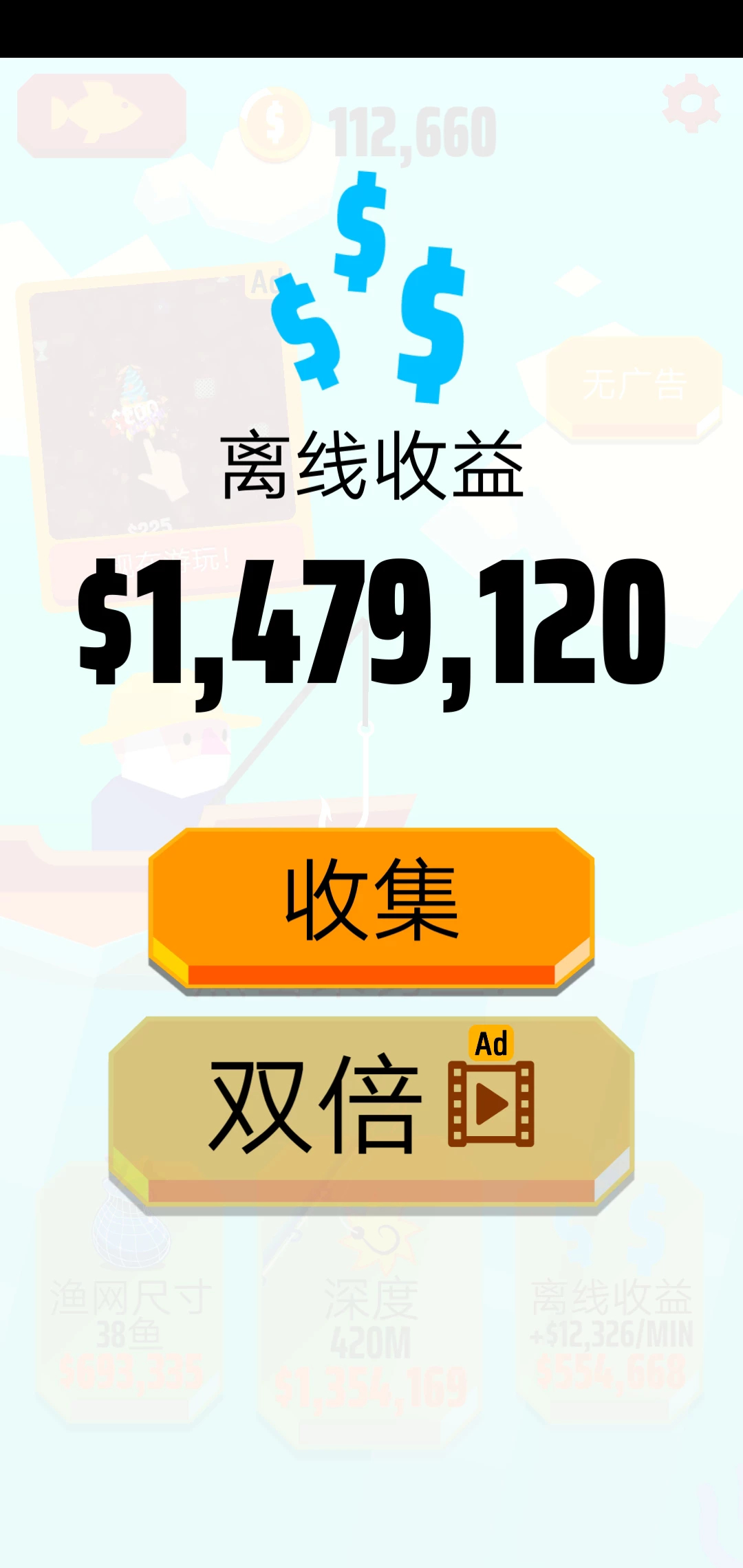 建议各位先升级钓鱼深入的米数再升级可以钓多少鱼,因为深处的鱼真的好值钱啊!比如大海豚,河豚什么之类的,超级挣钱。不过前期这种品类的很少,但到四百多米出就超级多了~慢慢加油哦!