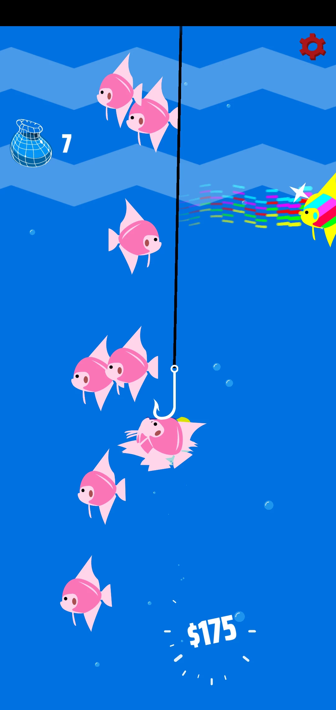 游戏的音效真的很赞,水泡咕嘟声还有绳子拽钩子的声音~玩这个游戏一定要开声音哦,否则就毫无意义,我这么认为~彩色的鱼就是双倍的价钱哦~那个声音也是很好听!