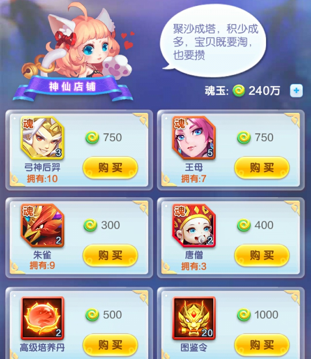 后期主要就是补足图鉴了,购买时候需要平均升星,可以最大程度避免神仙碎片溢出导致收集速度降低的问题。