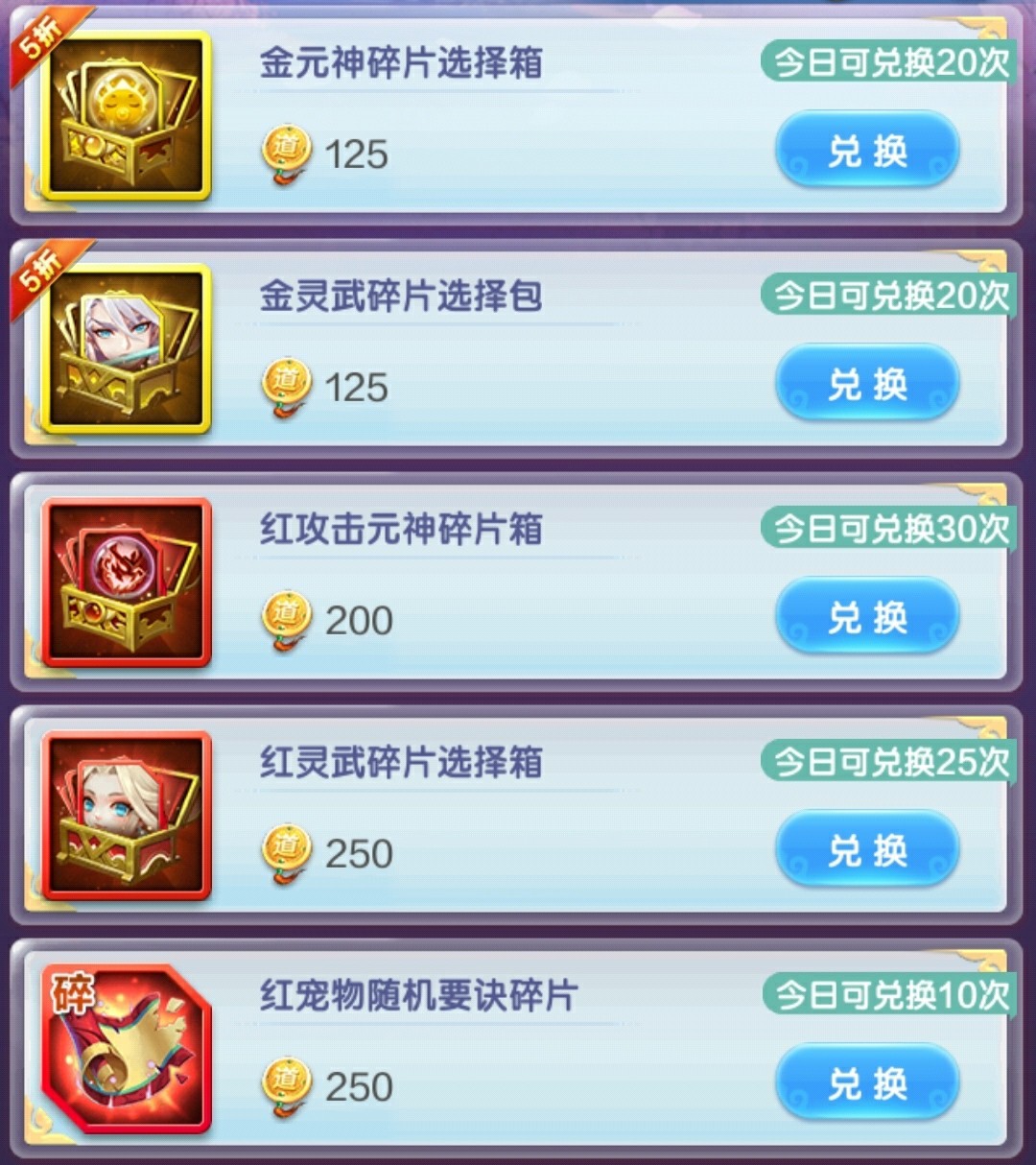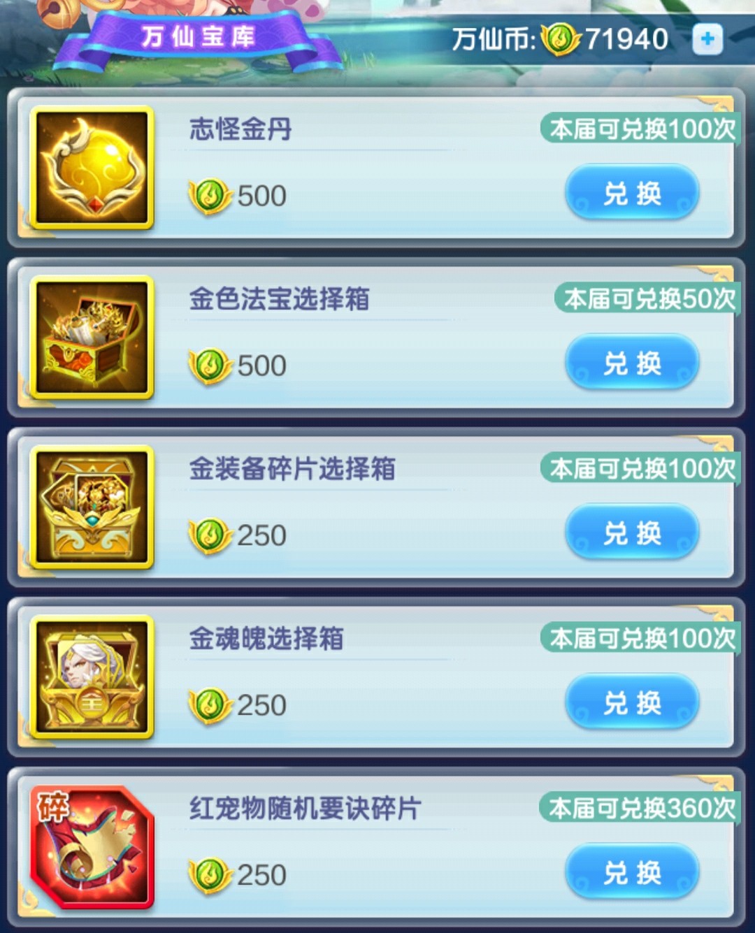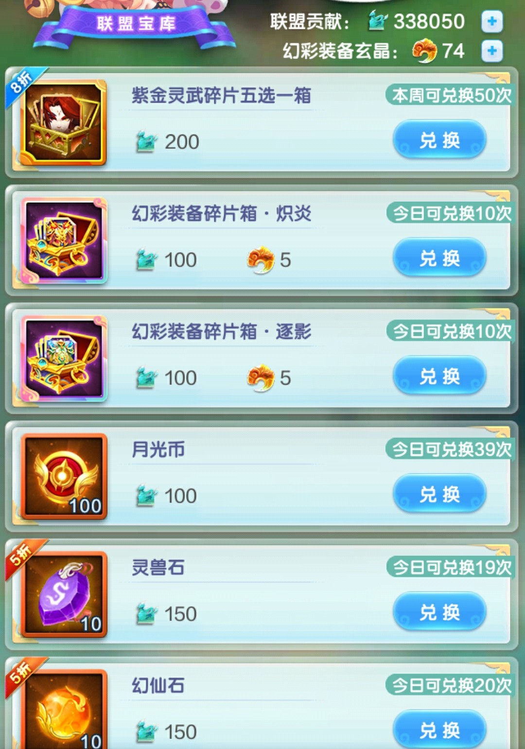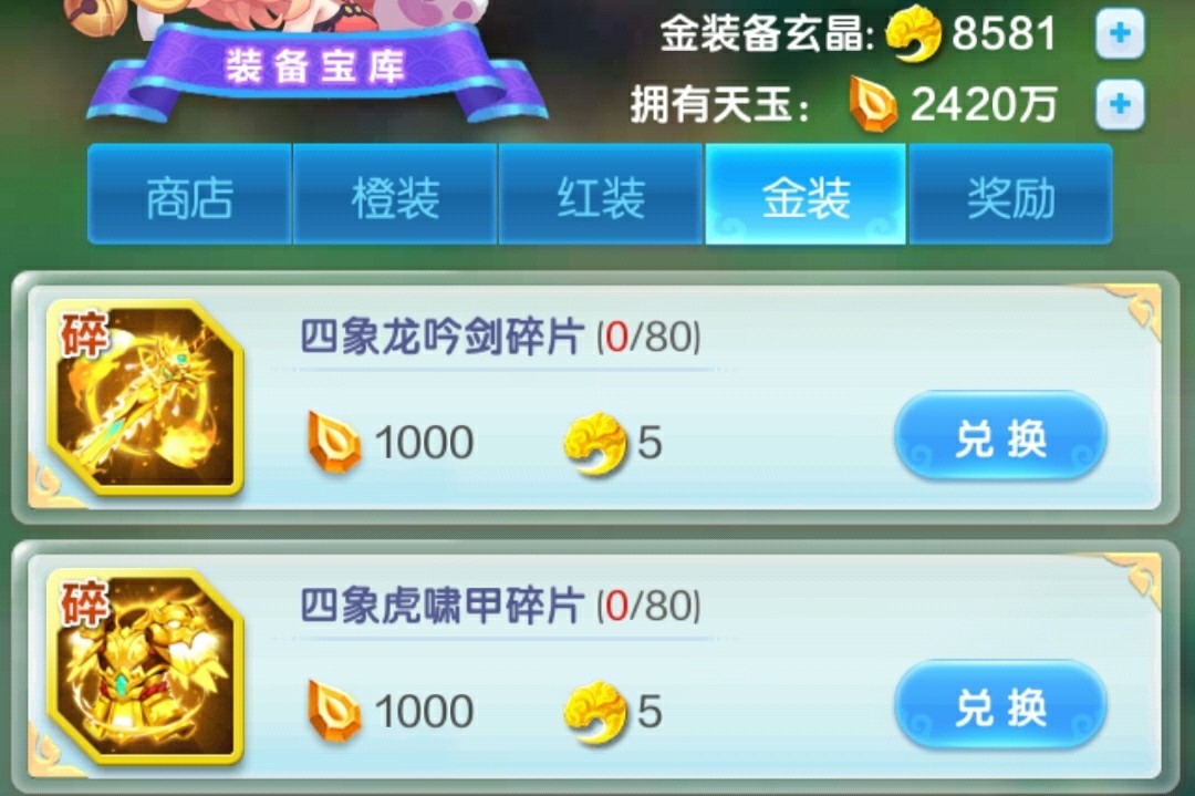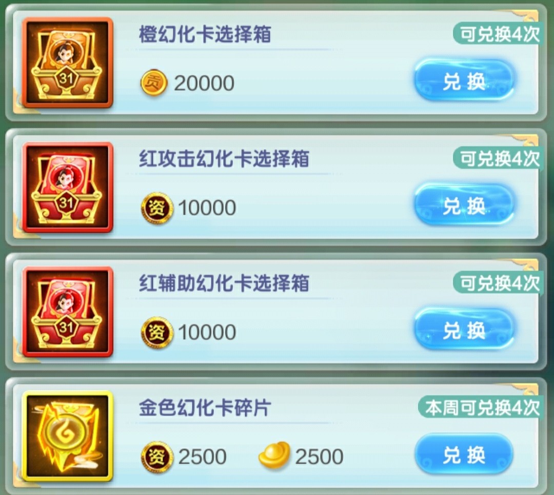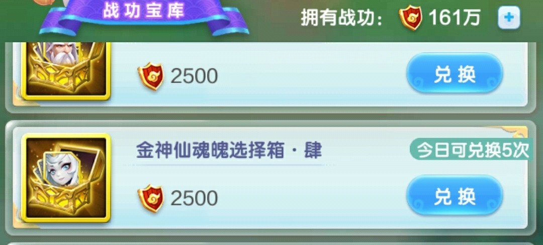 幻彩装备选择箱,所需属性的装备每天买光,前期主将风属性,剩下的神仙水属性。后期全部水属性(压攻击的话,这个神仙带风属性)。灵武没有满培养之前,紫金灵武必买,开图鉴+升星!