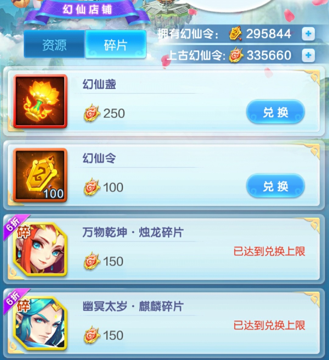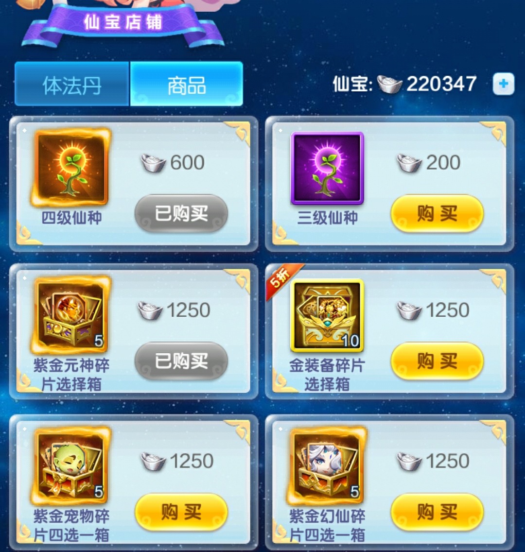 右边的店铺以金幻仙图鉴和升星为主,优先图鉴再升星。如果遇到培养更高品质幻仙急缺幻仙盏,那么优先购买幻仙盏,然后再考虑这里的金幻仙升星。