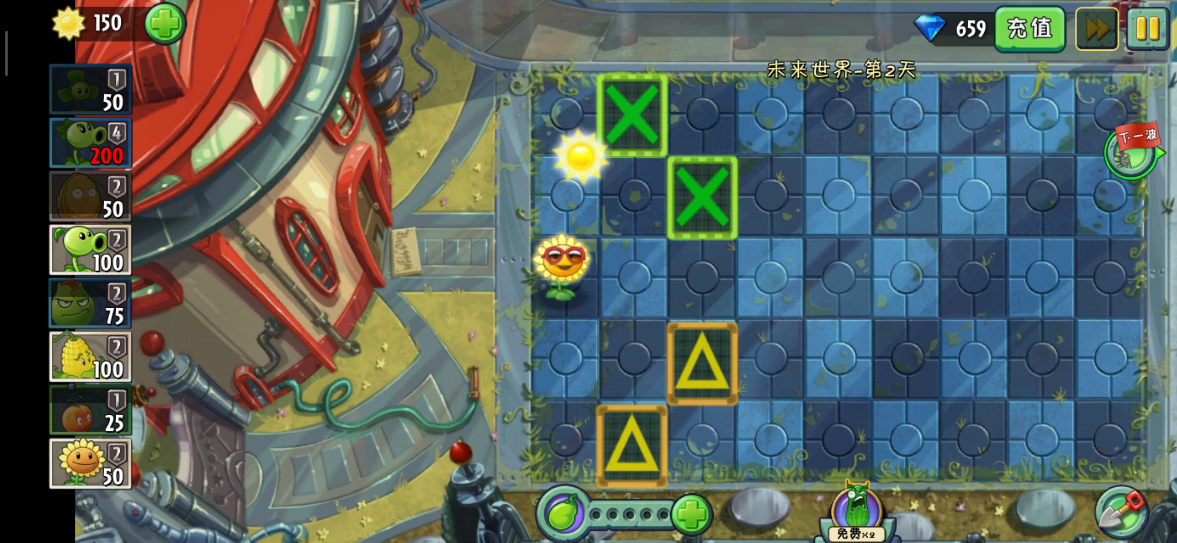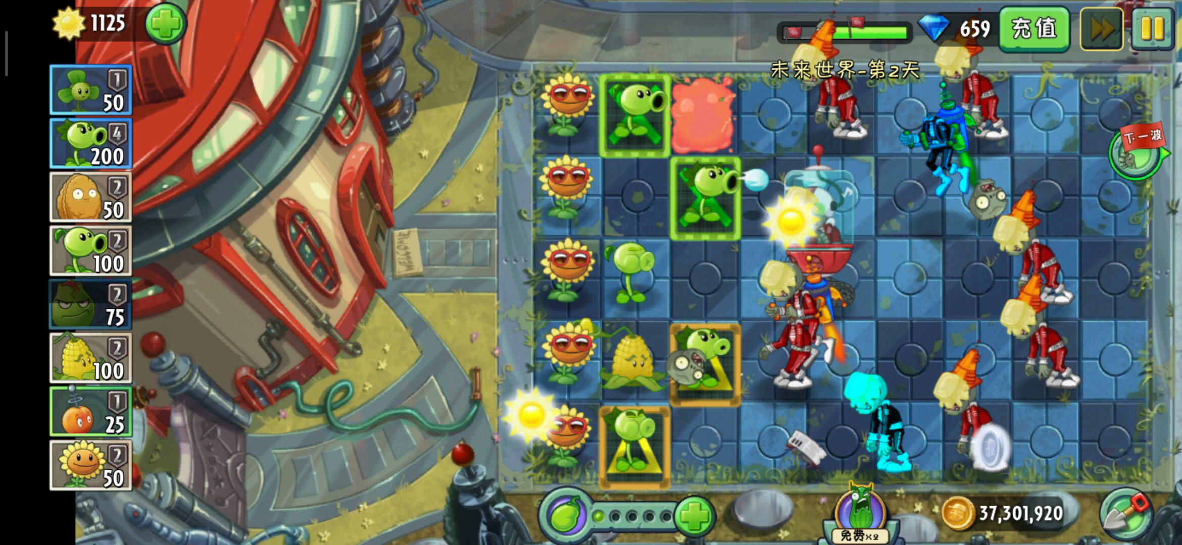 在这一关里面登场了新的僵尸是喷射器僵尸和电磁盾僵尸,未来僵尸,未来铁桶僵尸,未来路障僵尸,他们并没有什么其他的改变,只是把名字给换了一下,而这一关的主角是喷射器僵尸,是会在这一关中大量出现的,这个僵尸我们的植物是挡不住的,除了高坚果,这种特别高的植物可以挡住它,其他的我们常规的植物都挡不住,它会启动加速器直接越过植物,而且这个,喷射器僵尸他的防御力也比较高,总之打起来也属于比较费劲的那一种,而且在之后的关卡中他将会作为主要战力出现,那么如何对付他呢?我们的三叶草就发挥了作用。