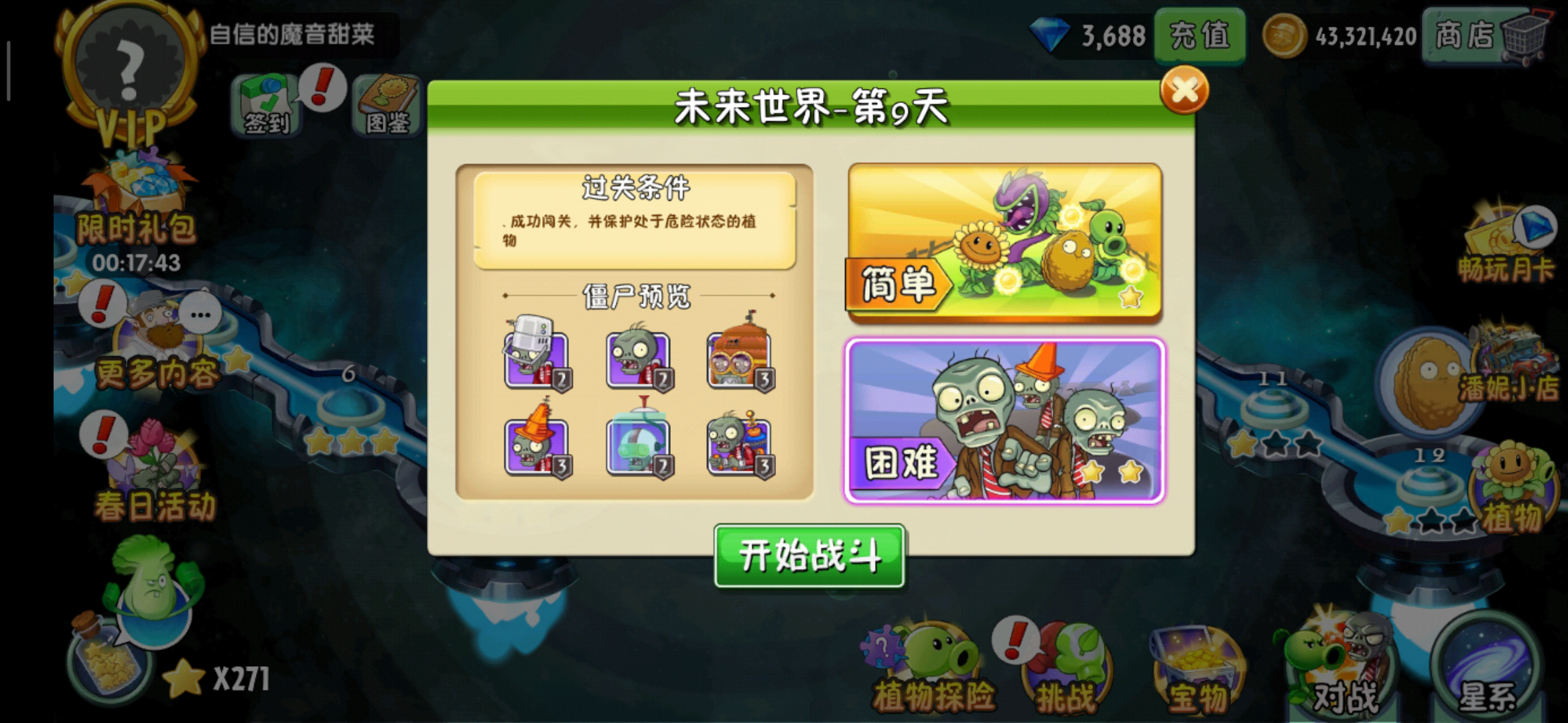 这一关需要我们保护的植物是星星果,谢兴国可以攻击五个方向的僵尸,可以攻击上方,下方,后方还有斜上方和斜下方的僵尸,不能攻击正前方的僵尸,而我们需要保护的星星果是在草地右侧第四的列位置,而且还是一整列。虽然他们的位置挺靠前但是,我们貌似,不用太过于担心他们的安危,一整排的性行果几乎可以攻击所有防卫的僵尸,而且是同一时间可以对一个僵尸进行多次攻击。简单模式我们不讲,主要来看一下困难模式。