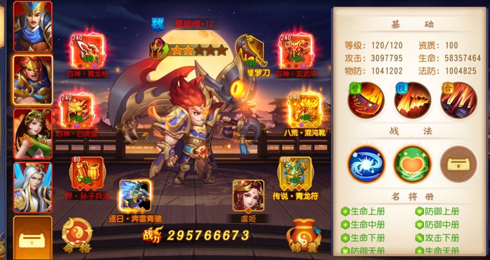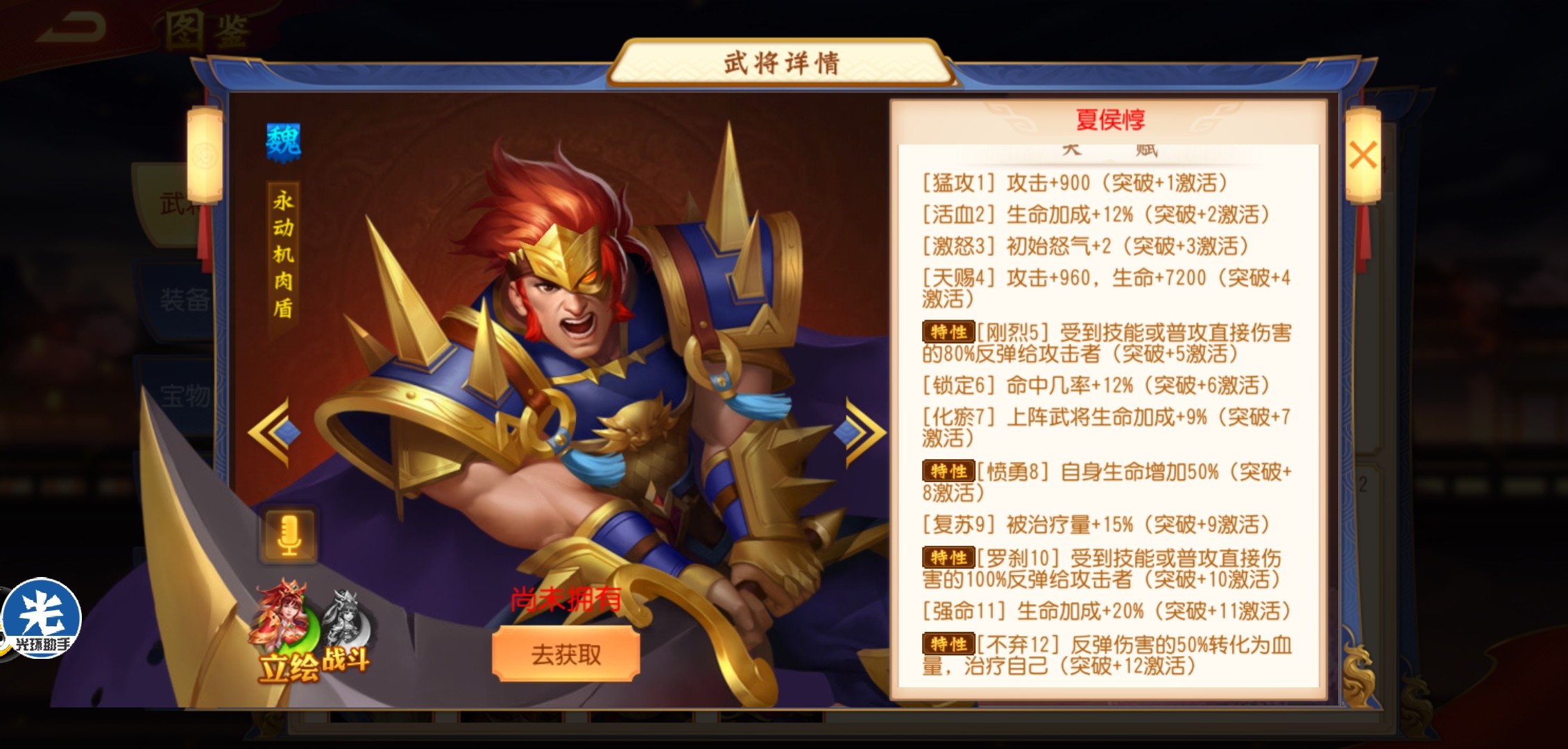 二、生存能力强,通过天赋技能,战法,玉石,神兽等就能回血,如果不能一击必杀夏侯惇,即使没有治疗武将夏侯惇第二回合可以恢复到近乎满血状态。