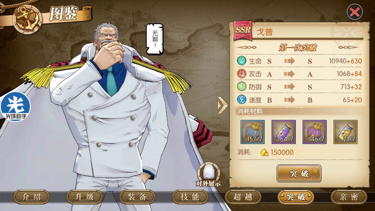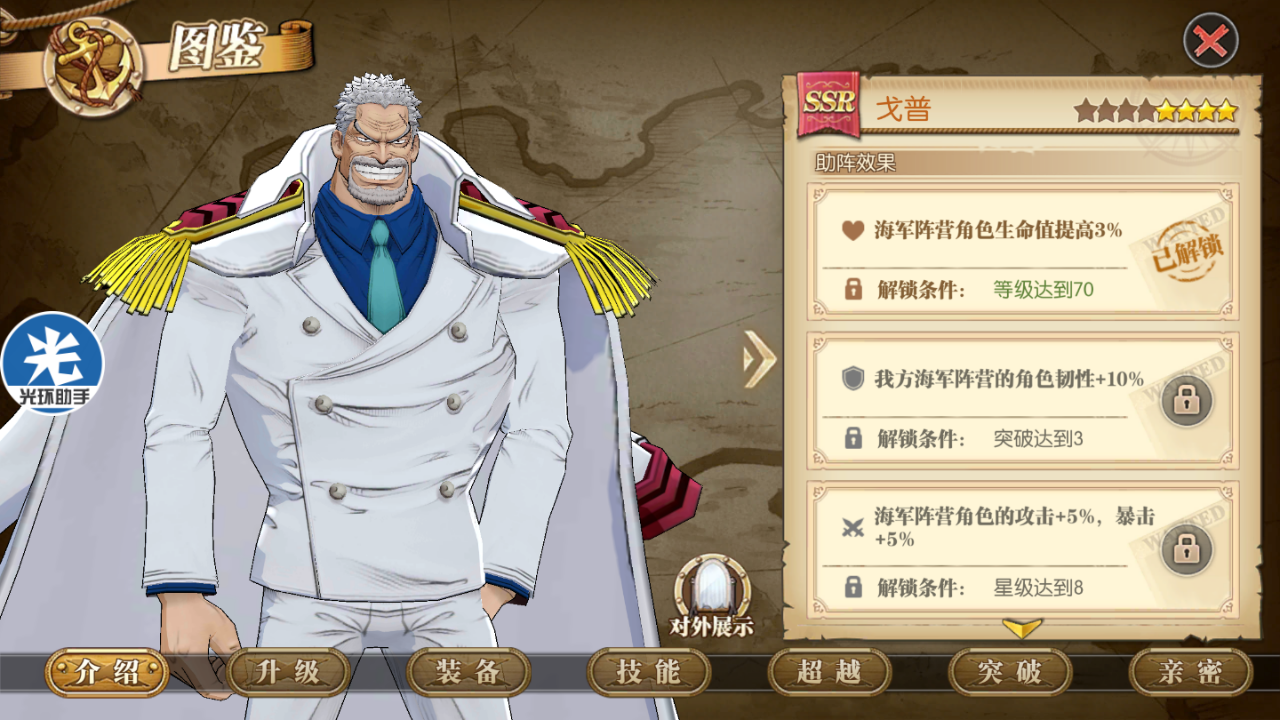 卡普,游戏中最能被成为肉的肉,最能抗的角色之一。特性:韧性,血量,格挡,防御极高,同时还有极高的回复能力,开启大招后是游戏中最肉的角色,免疫所以异常状态包括属性伤害。打主线或者打pvp都是很好的存在,但缺点就是没有输出,一丁点都没有,所以目前只能活跃在打剧情方面和海军王阵容。缺点:速度慢,容易被控制放不出大招,没有输出能力。