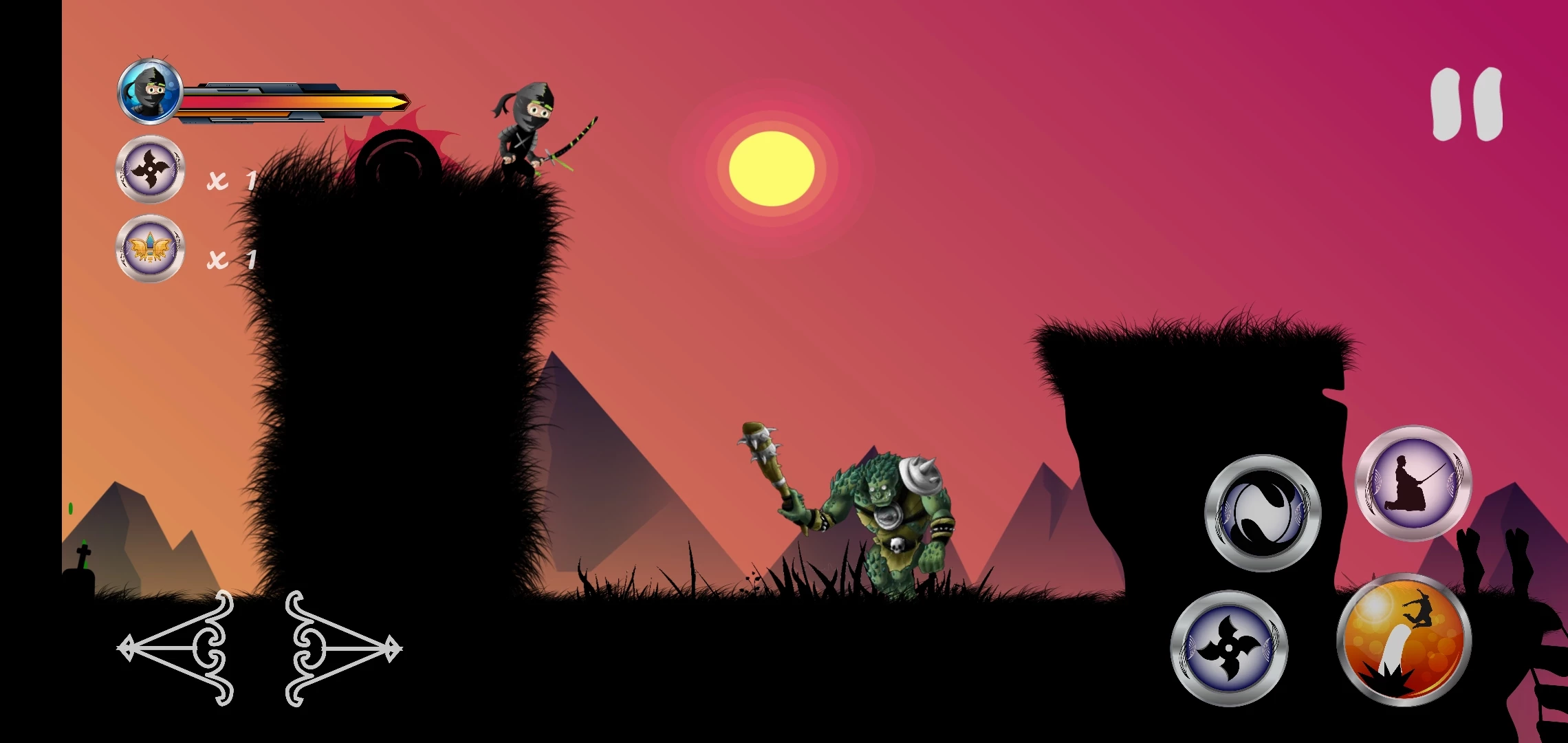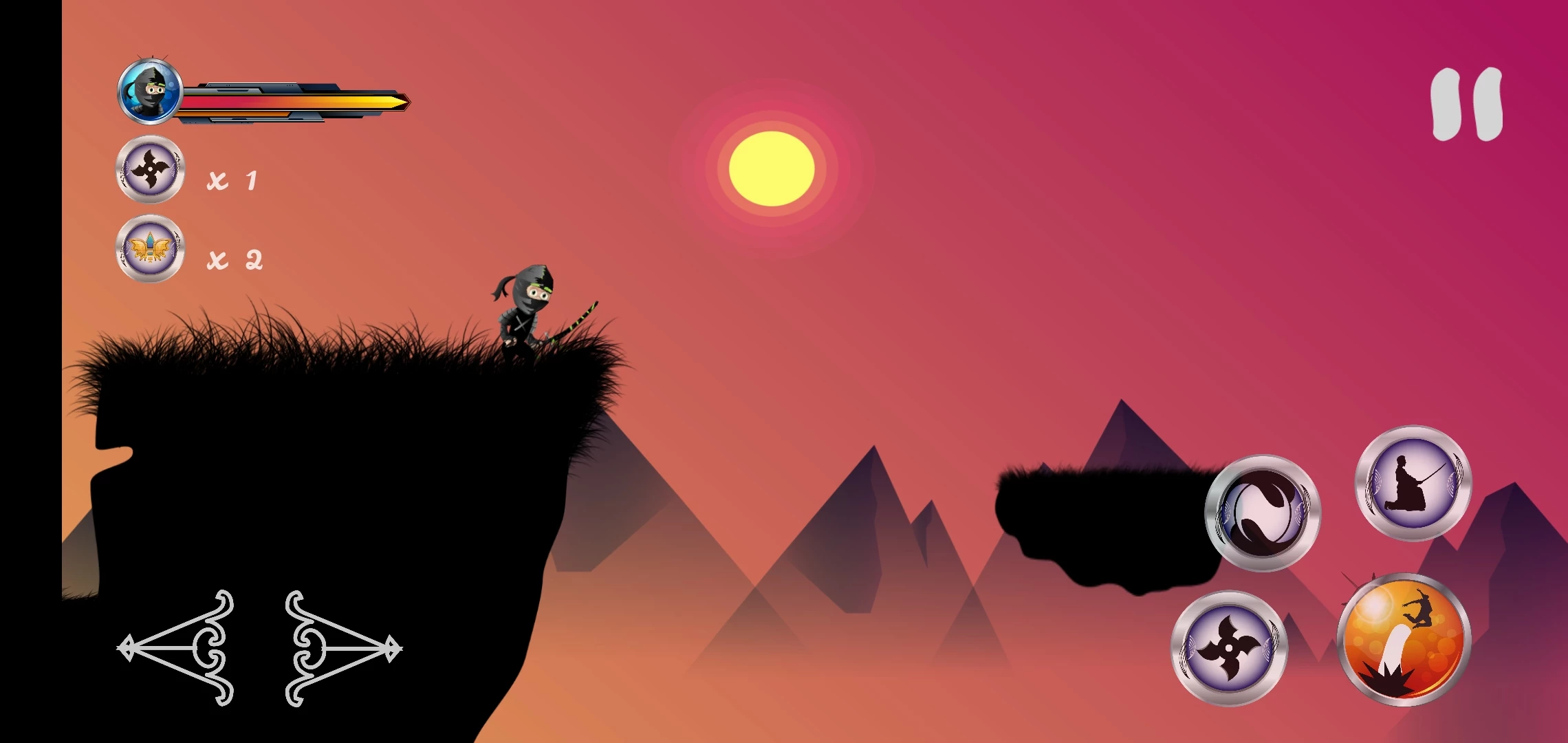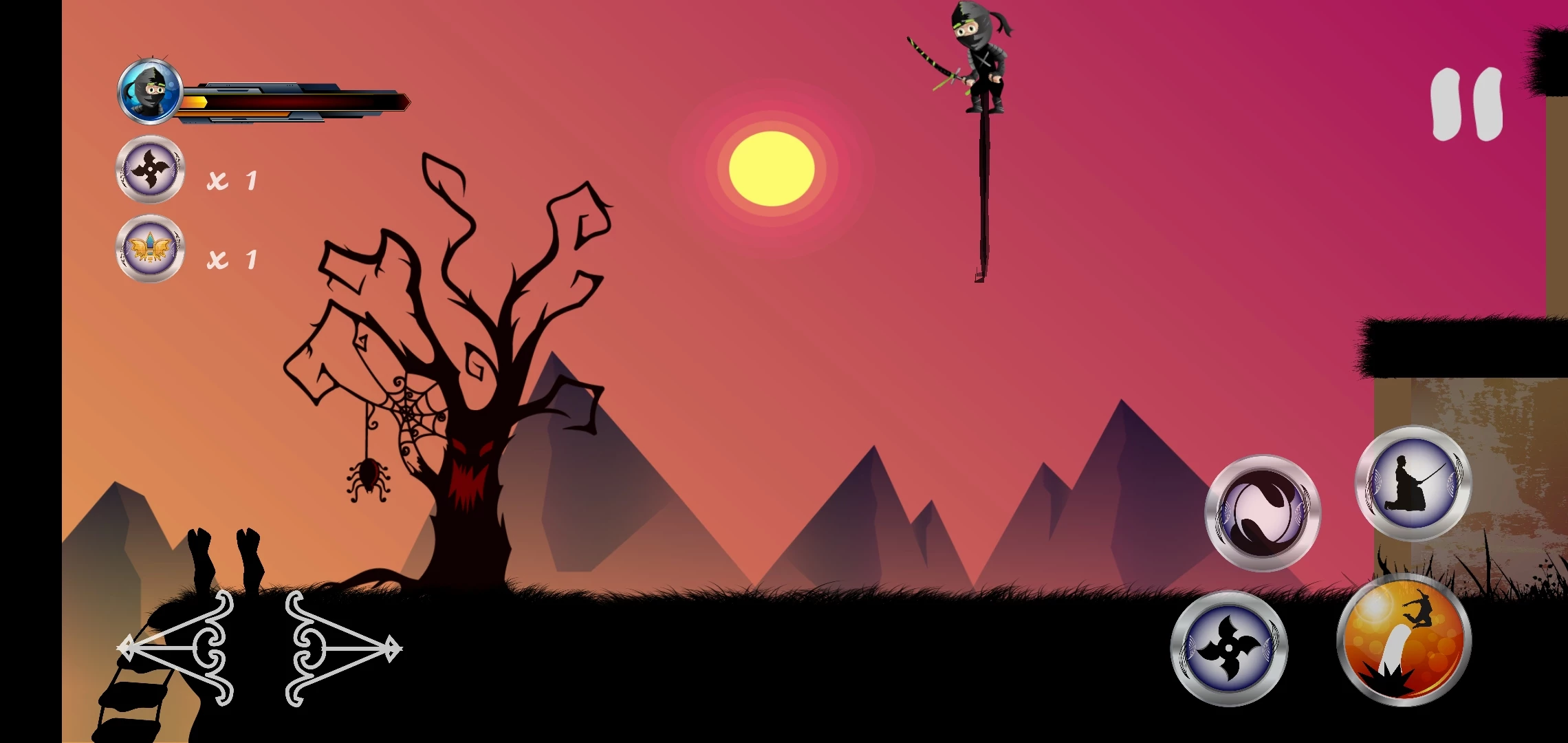 因为忍者在跑酷时需要不停地上蹿下跳,所以“跳跃”会经常用到。例如,游戏一开始忍者就需要跳到对面的草地上,如果不用跳跃,就会直接掉落,游戏失败。