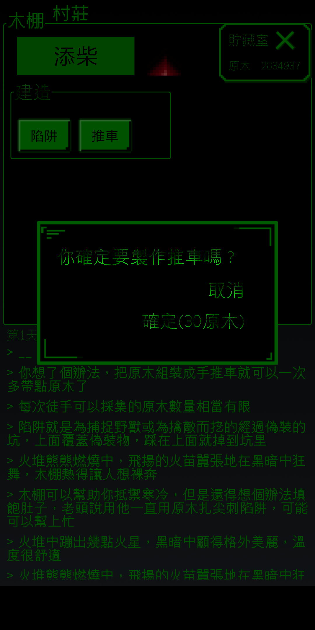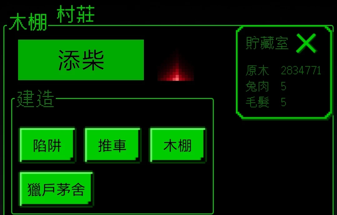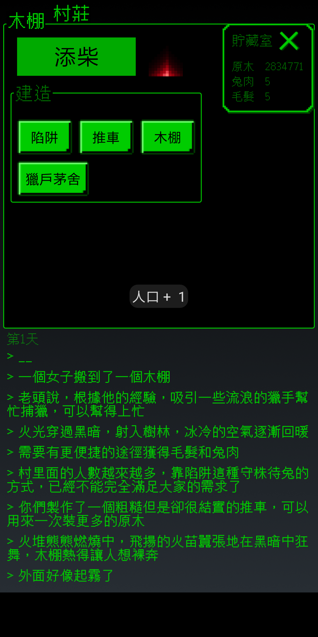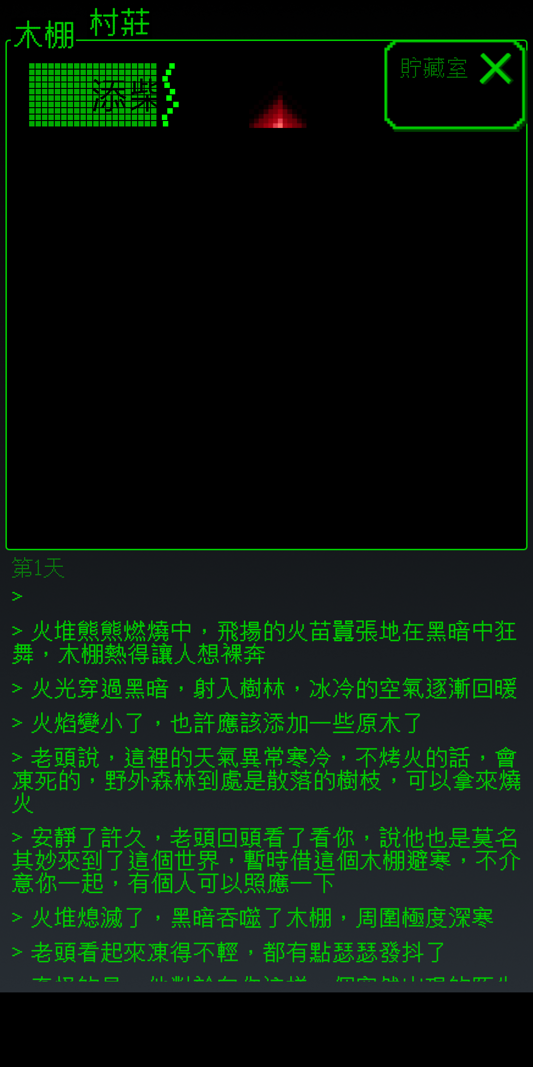 在玩法上,《界中界》基本是以绿色的文本框来推进游戏进度,在屏幕上方会出现各种各样的选项,下方则是游戏信息的反馈及文字描述。初始来到异世界,我们会与神秘老人见面,他会告诉玩家木材是最重要的资源,在寒冷的异世界必须不断拱火才能活下去,而玩家就需要通过采集木材来保证生命。