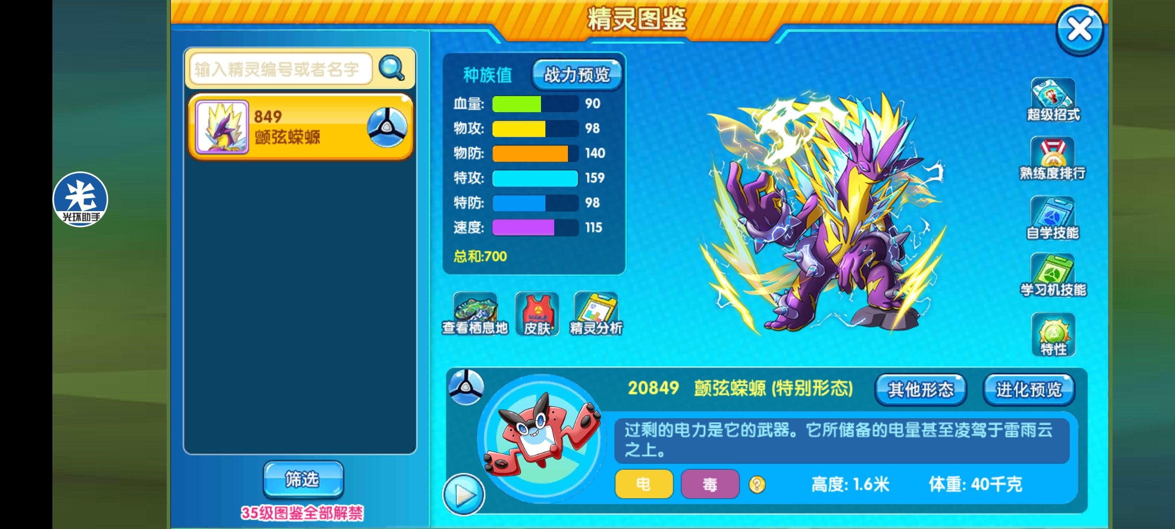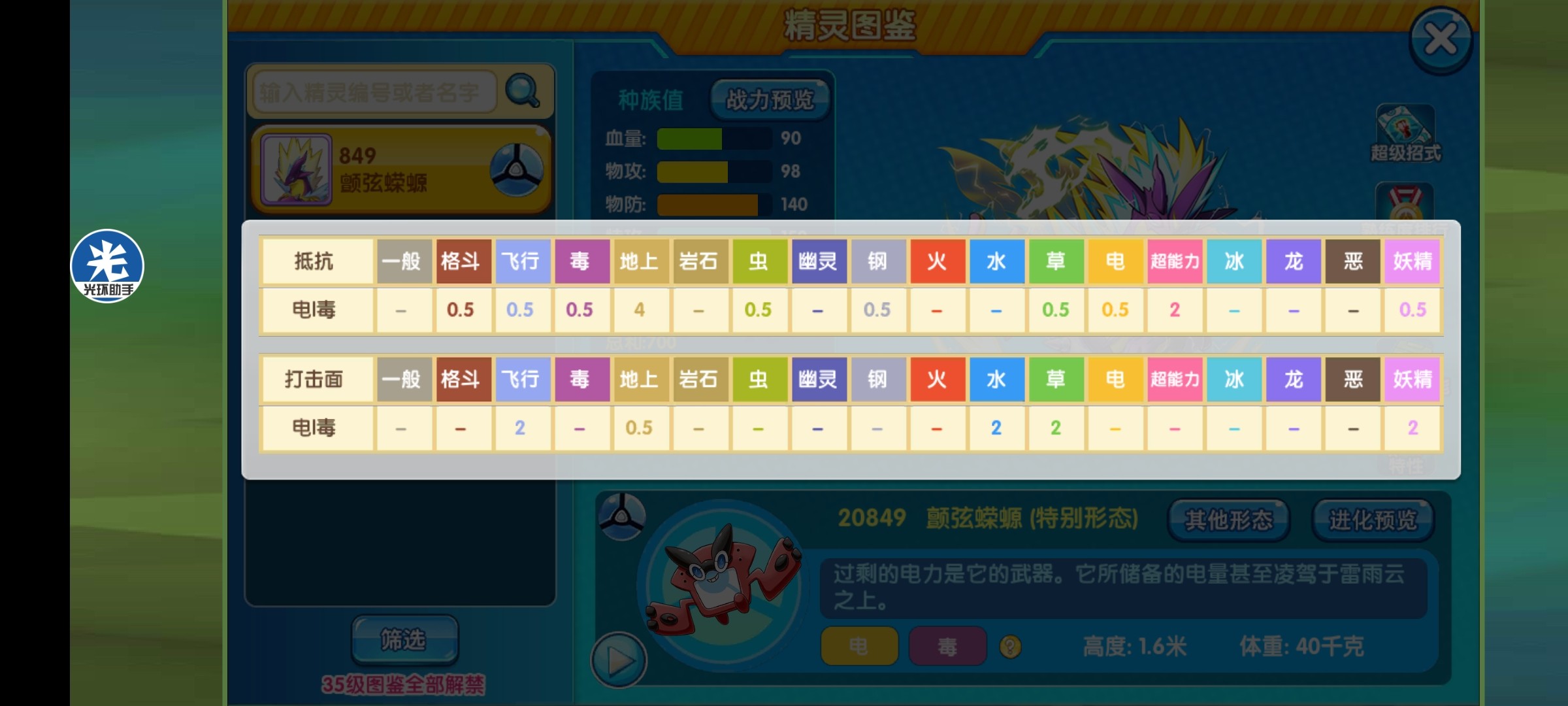总结:伽勒尔地区的颤弦蝾螈有著两种不同的姿态,分别是高调的样子和低调的样子。 颤弦蝾螈是深紫色的类人蝾螈,它的下巴到腹部、手掌脚掌和腿上的斑纹是黄色(蓝色)的。它的头上有一片(两片)黄色(蓝色)的闪电,手腕和腰部,背后都有刺状突起。它的胸口有六条(四条)弦。而超极巨化之后的颤弦蝾螈身体趴下,身上长出了不少的尖刺,过剩的电力是它的武器,它所储备的电量甚至凌驾于雷雨云之上,超极巨化的颤弦蝾螈因毒素蔓延到了大脑而失去控制,在复刻极巨化日益增多的情况下,很有可能它的极巨化也会出现,期待那一天的到来,好了,我是@白,我们下期再见。
