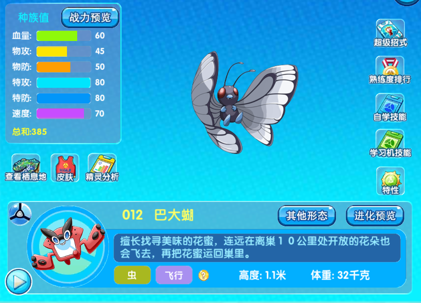 这两个的宠物技能学习面比较接近,种族值稍微有点差距,属性也不同,不过这两只宠物共同点都是可以在高级狩猎场中捕捉宠物,从出场率来说,毽子棉还是略高于巴大蝴的,而且种族值也要高于对方,那么巴大蝴,就真的一无是处了吗?那么接下来就让我为大家好好的介绍这两只宠物吧!