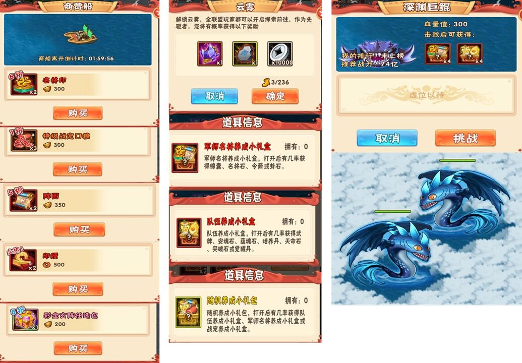 玩法本身奖励不算丰厚,从探索奖励到占领/击败奖励给的资源少之又少(和将军弈不分伯仲啊);其次商贾船售卖价格高且道具作用不大,基本上卖的没有一个有用的(我感觉我背包里面的东西也可以开商贾船去卖,卖的元宝我只要50%都行);但是成就奖励赠送的彩金/琉金神兵碎片还是特别香的啊