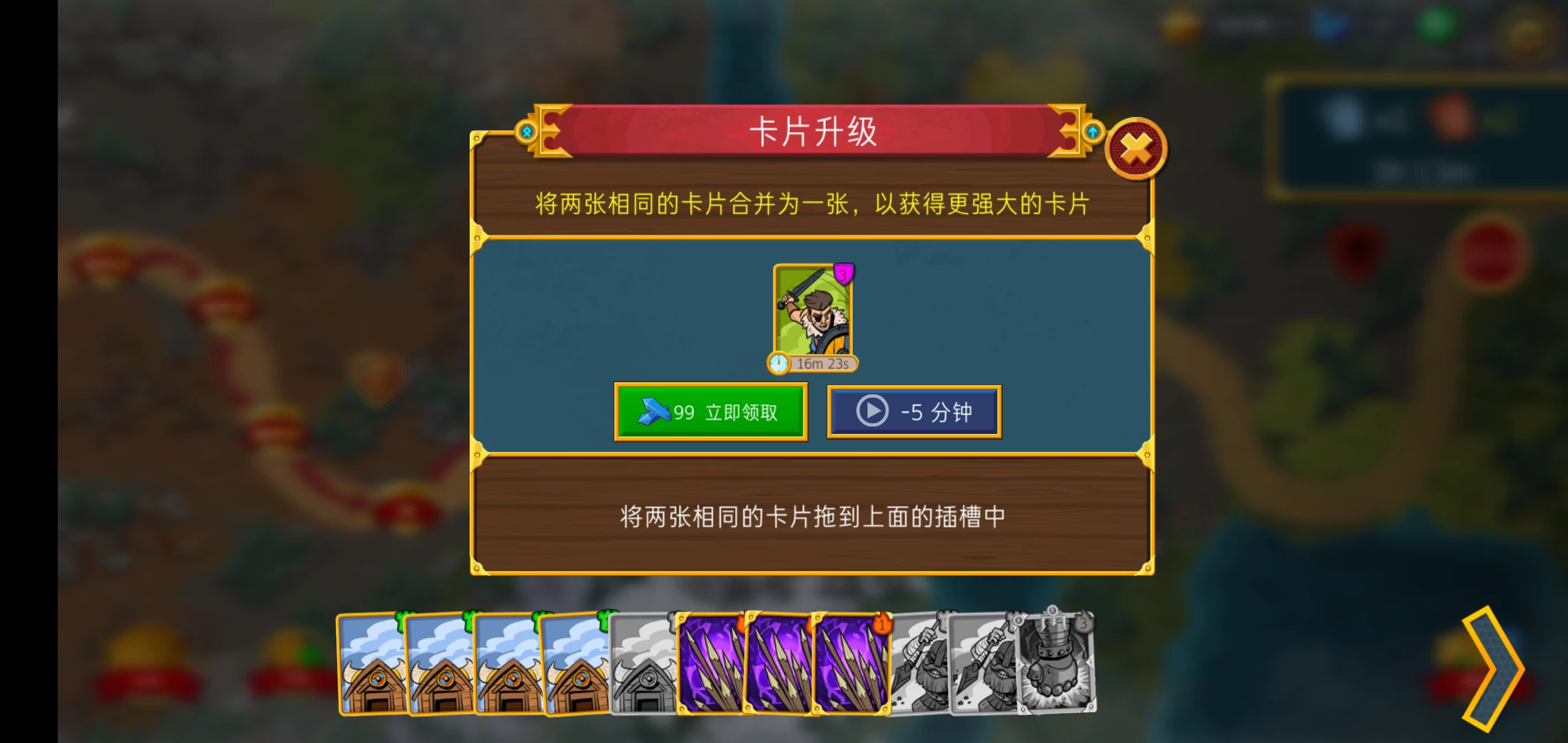 我们在不断闯关的过程中,会得到更多的兵种,也会有很多相同的卡片。升级兵种就和玩连连看一样,相同等级组合成为一张更高等级的兵种,兵种随着等级的升高,他的能力和水平也不断的升高。