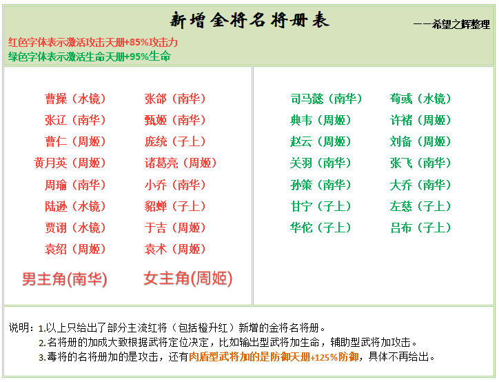 其中红色字体表示为+攻击的名将册,绿色表示+生命的名将册,括号内表示激活的金将。只整理了部分当前环境一些主流上阵使用的武将。