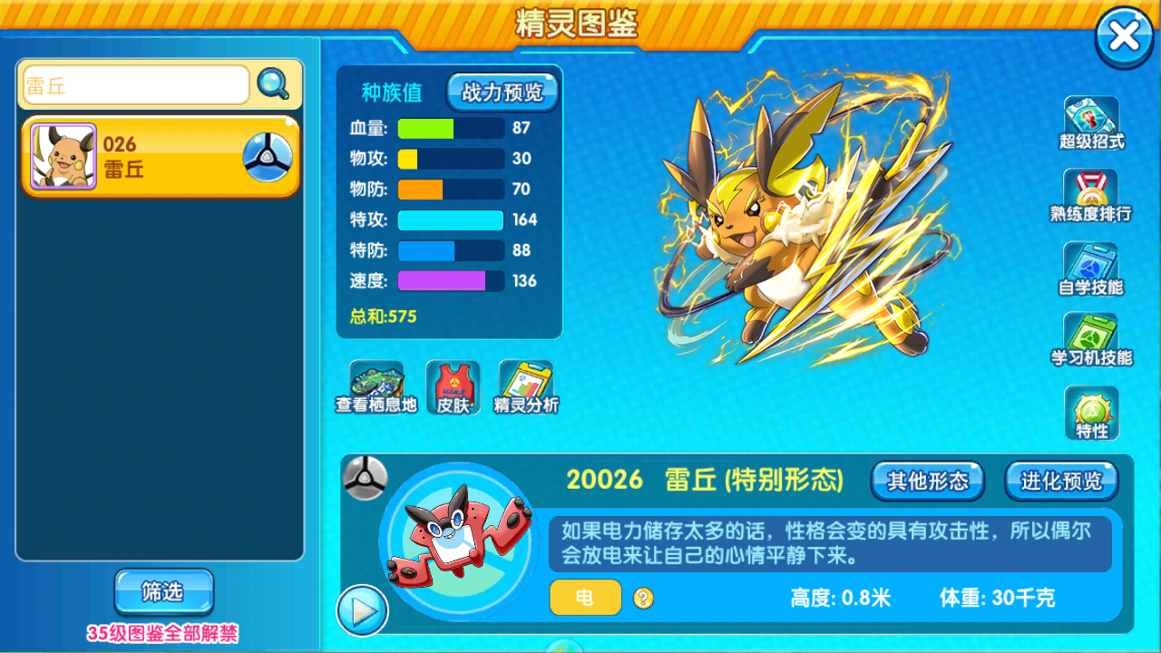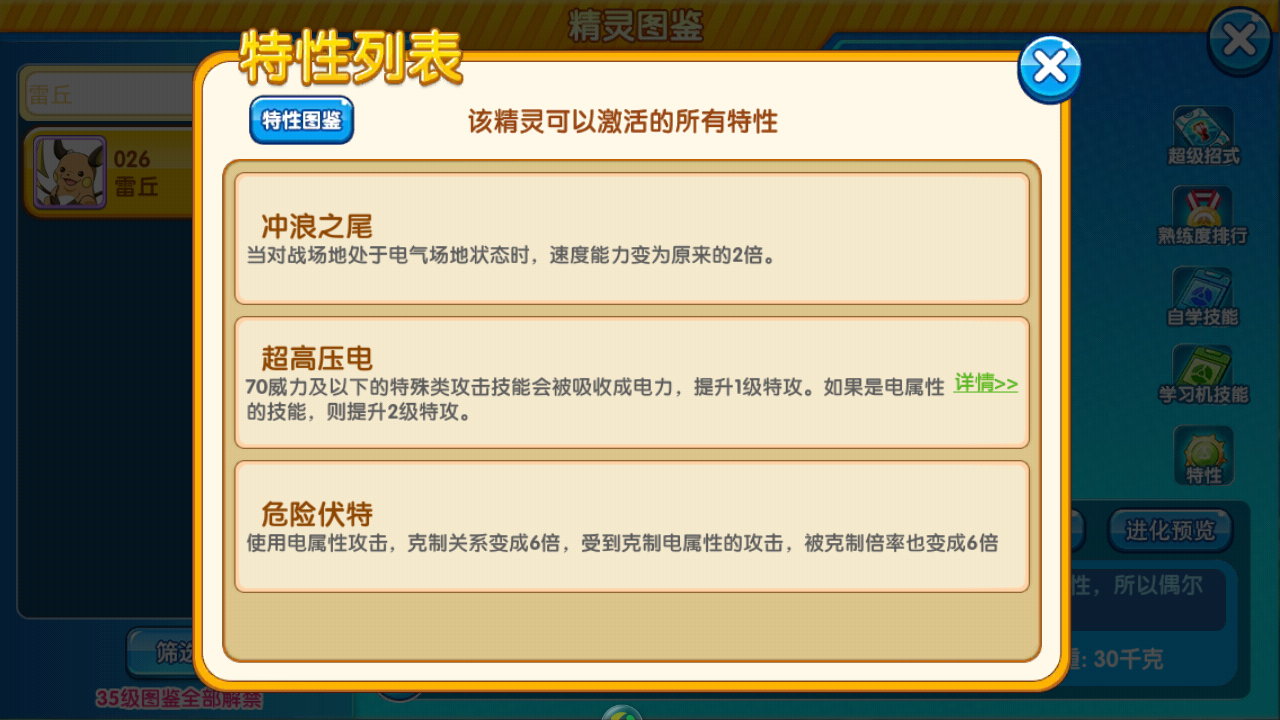 雷丘拥有三个特性,分别是冲浪之尾,超高压电和危险伏特。