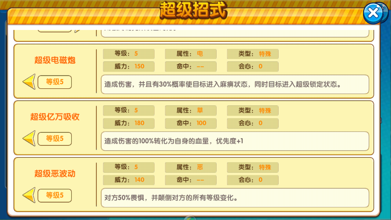 雷丘所能够学习的超级招式也十分优秀,各位训练师们可以将超级招式与普通技能互补搭配。本系的超级电磁炮伤害较高,一些追求极致暴力的训练师们不妨选择。超级亿万吨吸收和超级恶波动都是比较有用针对性的,而且超级亿万吨吸收还能提供一定的续航,建议携带命玉的训练师们使用,而且,在面对血量不健康的基格尔德时,先手加1的大招还能给对面一个“惊喜”;超级恶波动可以用于针对月神。另外雷丘还可以学习超级急冻光线,训练师们可以选择最合适自己的使用。
