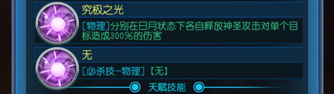 依旧是无必杀技能,分别在日月状态下各自释放神圣攻击,仅可对单个目标造成300%的物理伤害。
