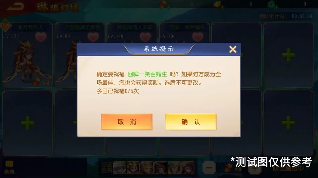 2、集结的队员需要达到4人及以上才可以进行祝福,每个主公每日有5次祝福他人的机会,观看不限制次数。