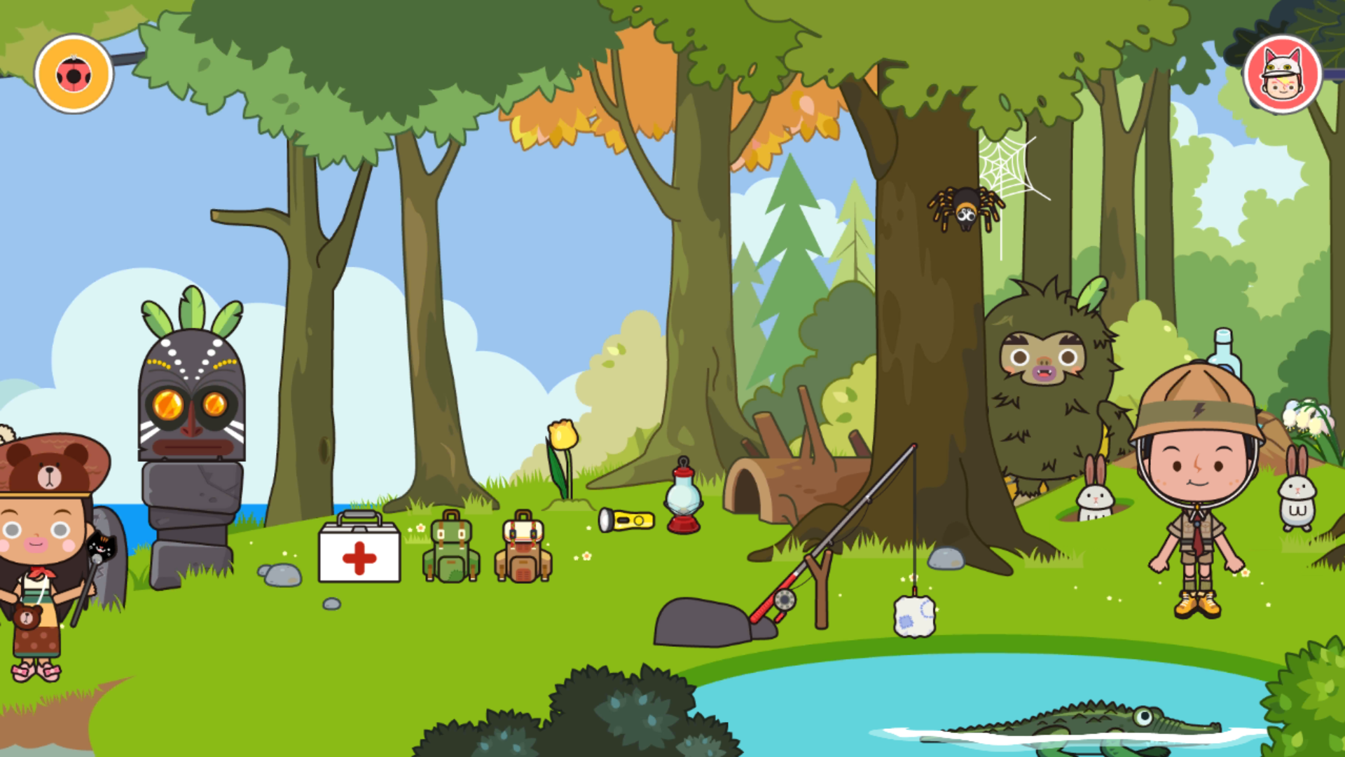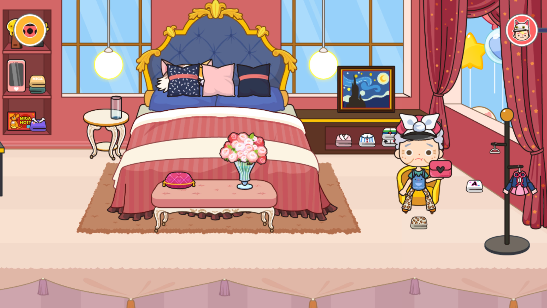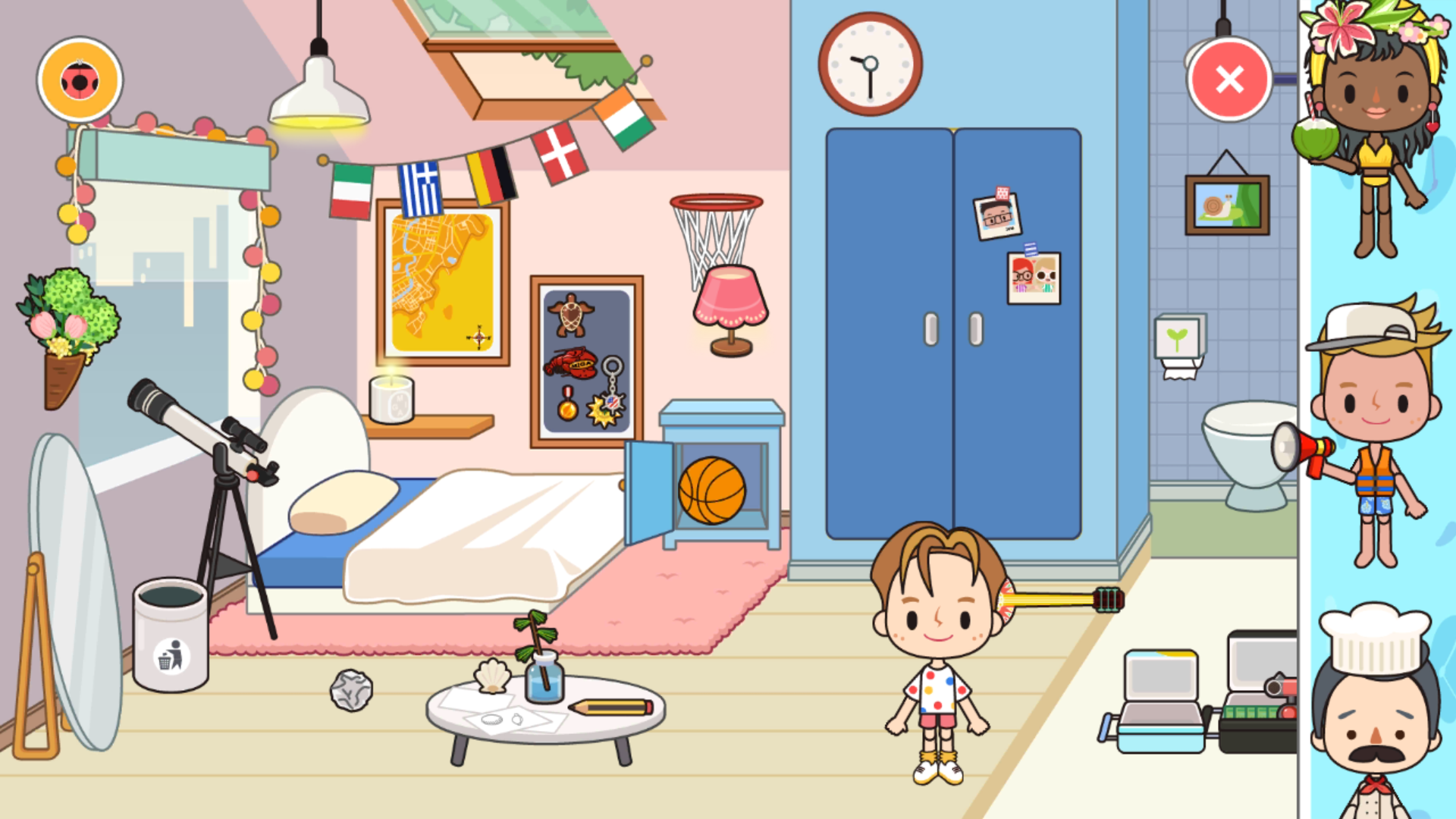 家里摆设着各式各样的家具,从床铺被席洗手间等生活用品,到吉他篮球望远镜等休闲娱乐道具应有尽有,这些看起来静止的所有物品,其实是大有乾坤,比如藏在柜子里的篮球可以拿出来,没事投个篮,看个望远镜(可调整角度),给主角换装,就连灯光都可以开和关,可以说是很真实很硬核,感觉超大型的过家家有没有?在家玩一整天都不腻。右上角粉红色的按钮,点击会出现各种风格和打扮的角色,有帅哥有美女,有魔术师有海盗,随时都能邀请他们加入你的派对或者旅行。对了,看到地上两个美美的行李箱吗,随时来个说走就走的旅行也不成问题!