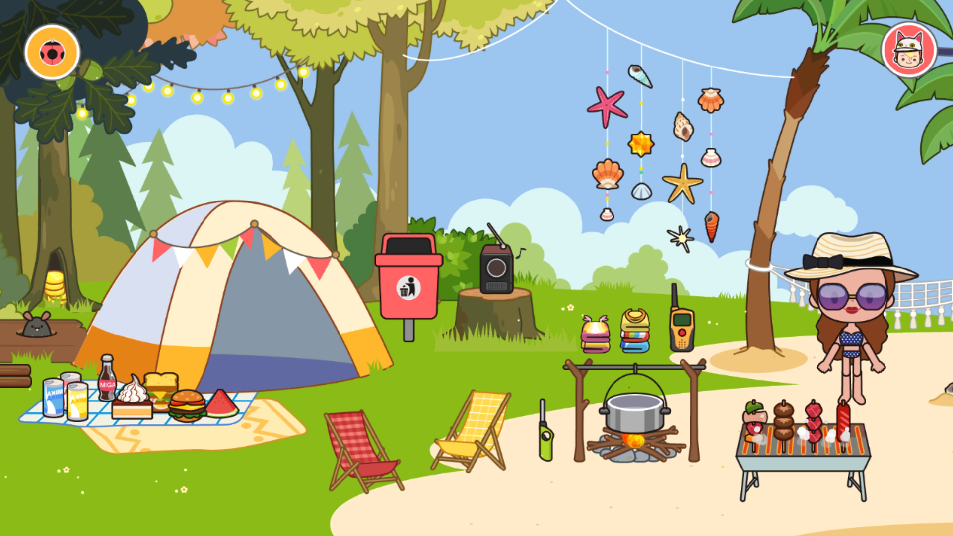 来到画面最右边,出现了一辆缆车,搭上缆车,让我们一起前往海滩和小岛。天啦噜!搭好的帐篷、准备好的水果饮料和烧烤,作者还贴心地加上了环保回收桶,连药箱都准备好了……昭君觉得这简直是完美的安排,考虑太周到了。