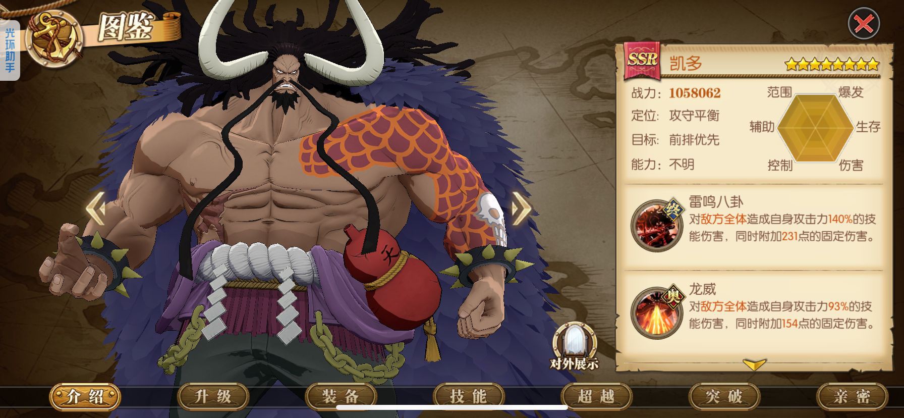凯多他有着高爆发的伤害,主要是凯多的怒意加成,每层怒意使所有伤害加成、暴击、速度提升最多可叠加3层,达到3层时,额外使攻击提升,所以凯多搭配一些高暴击爆伤的装备能打出不一样的效果,搭配上游侠套装,使得凯多在主线上更加锦上添花。在天梯中凯多核心的100级天赋龙之逆鳞,首回合,凯多在场时为身后一格的角色承担其受到技能造成的伤害,更好的保护了脆皮人物或核心的输出型人物。不过站身后的人物,只是不吃技能伤害,但还是能吃到技能的被动状态,除非该限定人物能免疫负面状态的效果。天梯上凯多有出色的保护能力,如果培养高的话,凯多搭配领主或处刑套装,有效针对高格挡的赤犬与高闪避的红发,因为凯多的奥义是必中,无视闪避与格挡。不过凯多没法暴击起来,那么凯多的效果更多在于站前排顶伤害或保护队友的作用。