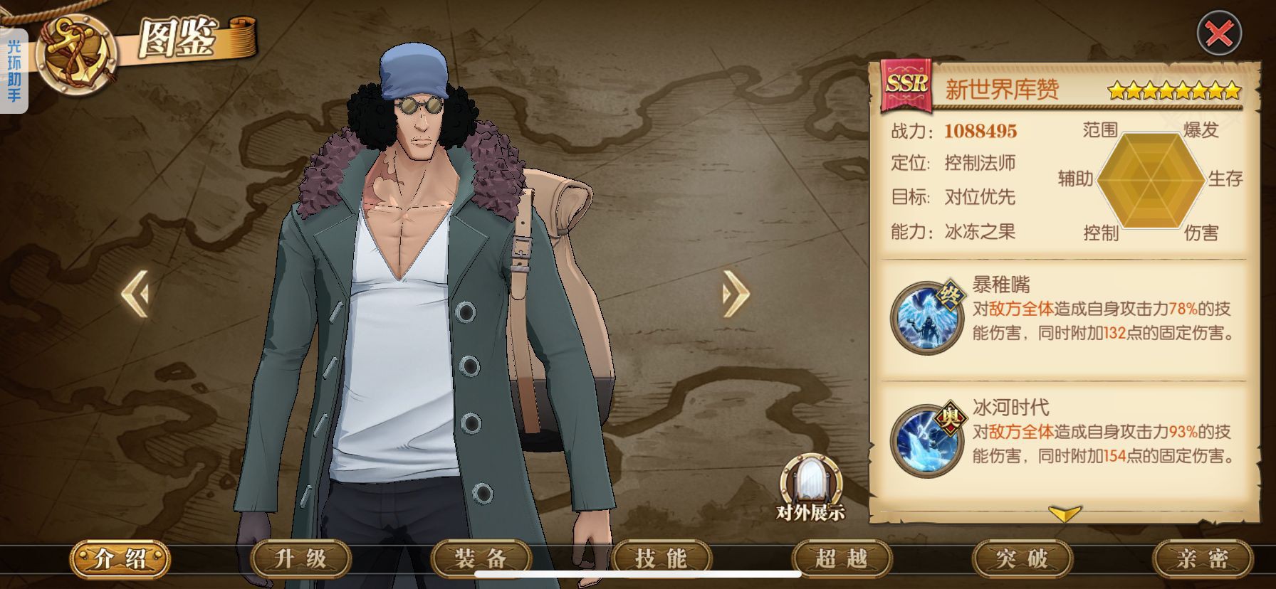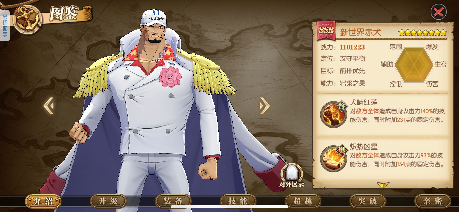 新世界的赤犬他的强大在于他能格挡回血、免疫负面状态与6星天赋流动熔岩消耗血量及天赋爆燃灰烬熔岩铠甲状态下施放终结技能时所有伤害加成提升必定暴击且无视目标防御及所有伤害减免。不过赤犬的生存与输出全依赖于铠甲状态下的效果,如果赤犬没有铠甲状态是非常脆皮的,很怕凯多的奥义暴击伤害,所以赤犬如何选择对的时机释放终结技能是很重要的。其次是赤犬的6星天赋效果流动熔岩(主线不生效)行动后对敌方全体造成最大生命值5%的真实伤害,搭配5魂技能熔岩爆裂的致死效果,很好的对对手的人物血量进行压制,更好搭配尾速大妈进行收割。其次赤犬的装备要求不高,起航、糖果、游侠这些装备都适合平民佩戴,有着不错的输出效果。