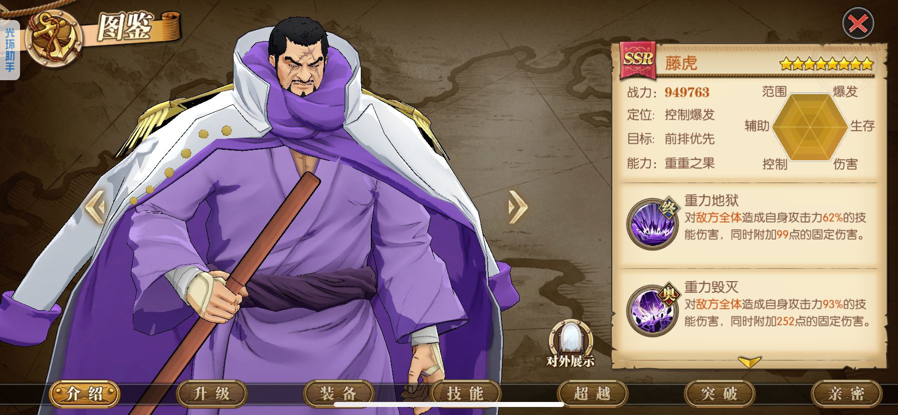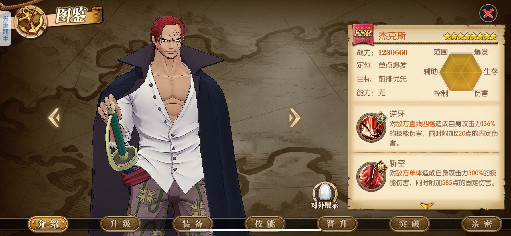 四皇的人物,在培养的过程中,优先推荐大家先培养红发再白胡子,红发现在更是吃香,有了晋升系统,红发的实力更加提高,晋升后的红发更加根据独臂剑豪效果,提高红发依靠高闪避的生存能力特点与奥义单体爆发伤害。开局进入半血状态与半血转为护盾值,除高闪避之外还有复活上的被动,使得红发在中端局的天梯中又一出色的亮点,晋升红发不死,是有能力一打五,不过很怕凯多与高命中的青雉。如果这2人下场,那么就是红发的主场,不过还是担心残血时被大妈有几率移除。