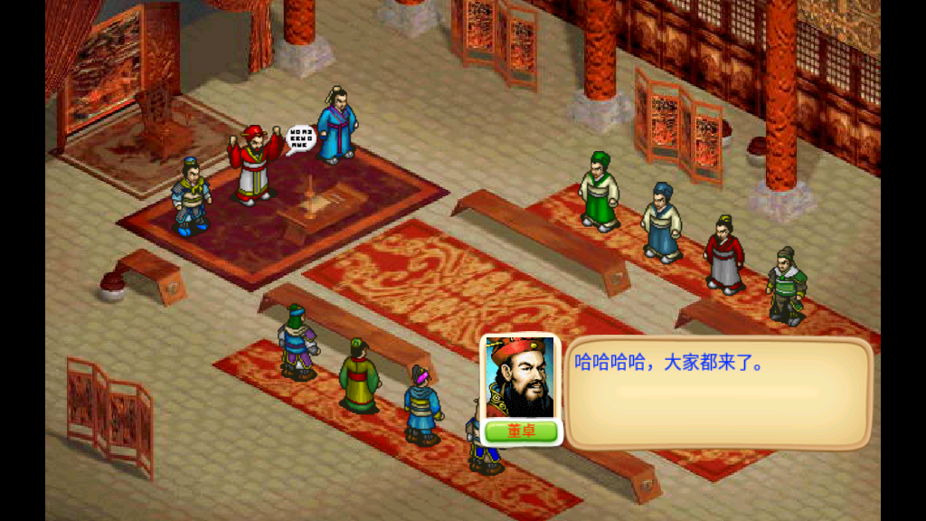 接下来正式进入第一章的剧情,董卓召集群臣,意图废汉少帝而立陈留王,众人敢怒不敢言,太尉向王允引荐曹操,令曹操主使促成群雄同盟以抵抗董卓的势力,游戏这才正式开始。