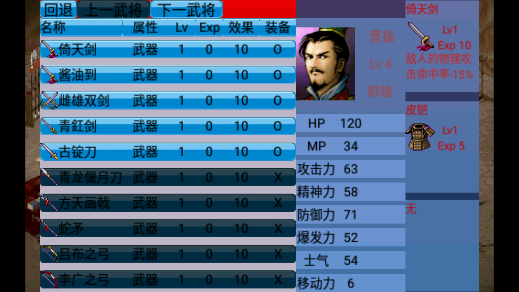 经过一大段剧情后,终于可以上手玩了,在这个界面我们需要给自己的武将买武器和防具,往后翻还有马匹、书籍等辅助装备,全部东西都在同一页,翻起来有点麻烦。