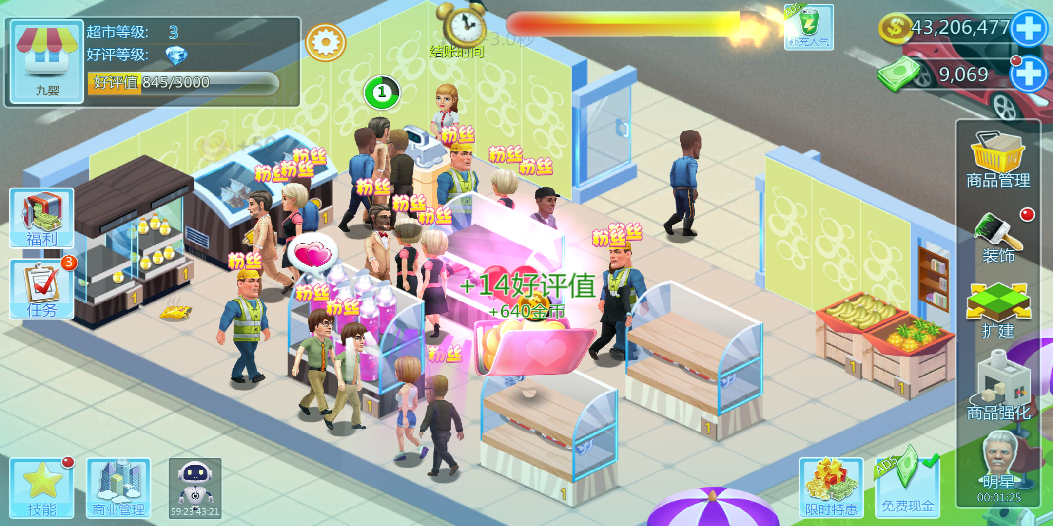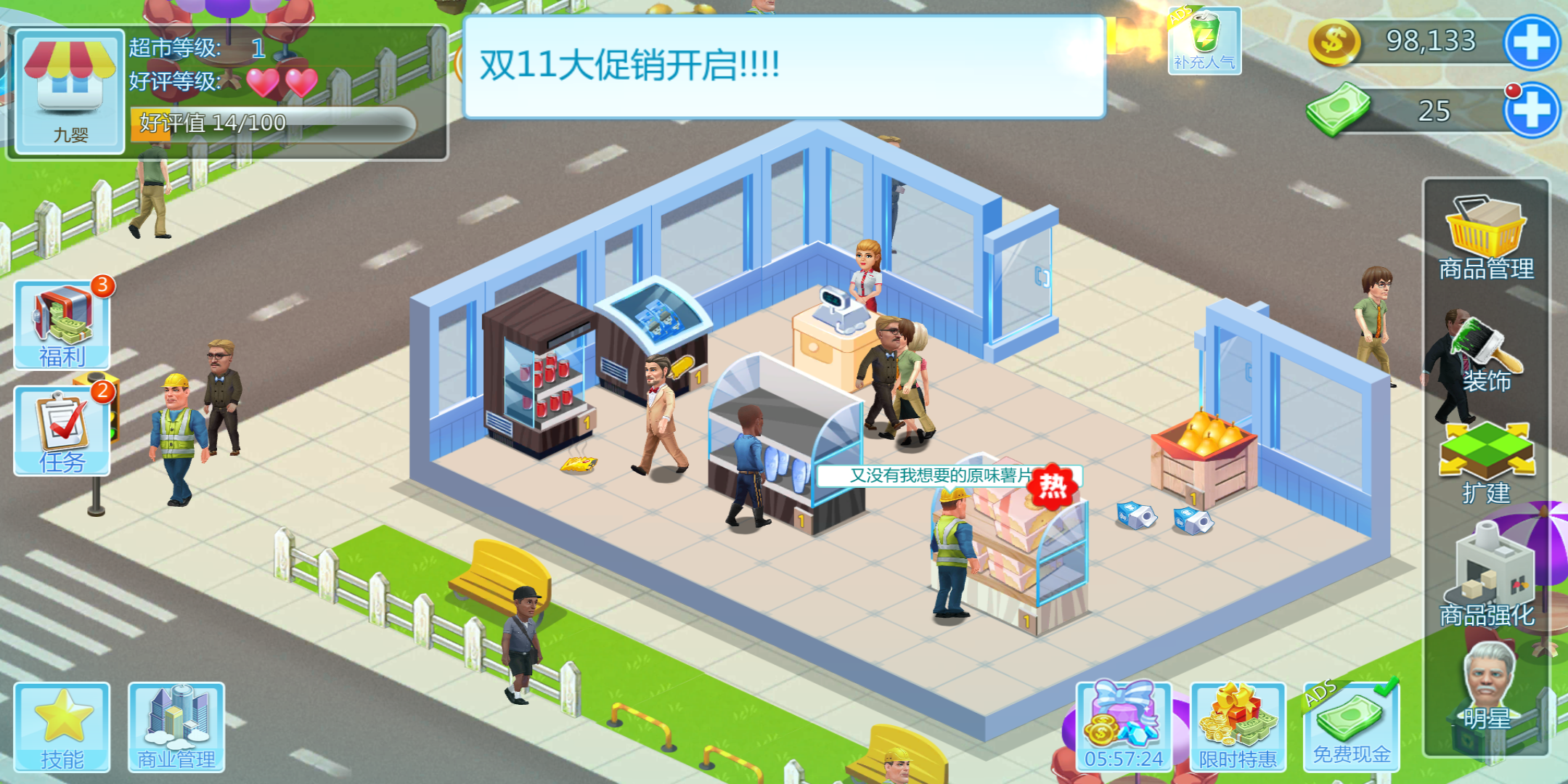 刚开始经营时,小伙伴们不要放过任何细节,所有的东西都会关系到你的经营好坏。当小伙伴们们上架客人喜欢的商品,收入更高了。及时清理掉地上的*,也会提升超市的好评度。开启世界著名的双十一大促销,店铺人流量达到峰值。到了一定程度,小伙伴们可以请来当红的明星,当然,和明星一起来的粉丝也会购买东西哦。