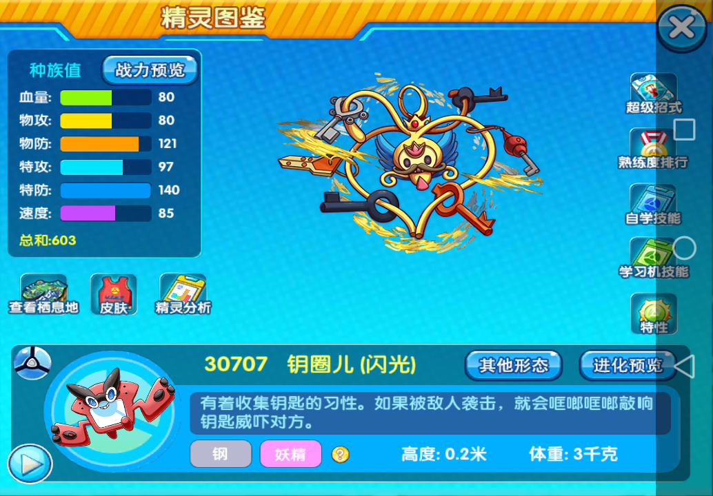 总结分析:我相信不少玩家都肯定被这个小精灵恶心过,本人也是,钥匙圈这个精灵依靠的就是恶作剧之心特性,可以先手下钉先手咒语,然后来应对一些墙角的宠物,也可以逼退一些对我方造成威胁的精灵,在种族值方面,我们可以看到它的速度不是特别的快,双防确实比较的高,再加上钢妖这种属性融合,让它可以抵抗更多的精灵,虽然说她的弱点是火和地,但是这也不会影响他的地位以及它的环境,钥匙圈目前的定位主要是骚扰以及下钉,无论是在高端局还是在低端局都可以看到它的身影,可以说是人人必备的精灵,V0玩家如果想要获得的话是比较困难的,但是可以通过一些游戏的周边活动和游戏内的特殊的节日活动,也是有机会获得到的。钥匙圈,没有任何的回复能力,所以说剩饭是他唯一的回复能力,当然了,也可以使用附着针,如果是在高端局里面,那就必须使用剩饭了,因为在高端局很多精灵都有大量的回复能力,如果钥匙圈没有回复能力的话,就无法在高端局发挥作用,如果在低端局的话,可以使用附着针,目前钥匙圈的环境不比以前好,但是还是比较热门的,虽然说高端局已经很少见到它的影子了,但是在低端局还是可以看得的,如何应对钥匙圈呢一般来说只有两种方法,第一种就是强行使用克制技能打,但是这一种的效果并不是很理想,还有一种就是白鬼挑拨,然后上闪光蜻蜓这种双抓阵容是最有效果的,在最后我想说的是,钥匙圈没有任何的回复能力,所以说保护好他的剩饭是最关重要的。