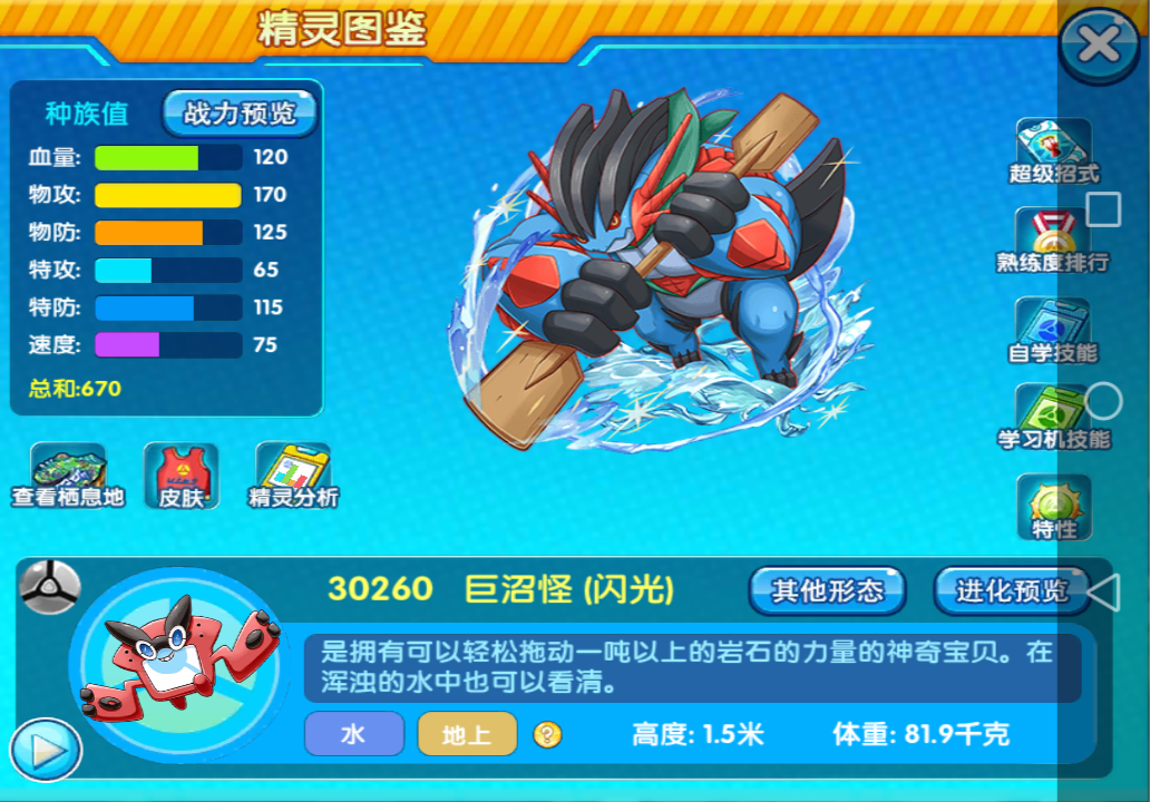 总结分析:闪光巨沼怪是2018年端午节的限定精灵,是特惠礼包给的,本来是不应该再售卖的,但是架不住玩家们的喜爱,所以在此出现在充值活动里面,从种族值方面,我们可以看到他的血量和物攻都比较优秀只是速度比较慢,但是也不影响这个精灵,在玩家们心里面的位置,而且闪光巨沼怪是第四个赛季的皮肤精灵,可想而知,他的地位以及环境是多么的高。现在的版本是火属性活跃的版本,所以说闪光巨沼怪有很大的发挥潜质,但他的速度慢,依旧是他最大的硬伤,但她可以依靠他的肉度和他的攻击力来弥补速度上面的缺点,而且和闪电鸟可以组成最强的雨天组合,这个组合刚开始出现的时候,非常的强势,虽然说现在玩的人比较少了,但是还是依旧非常的厉害,而且闪光巨沼怪也有专属,能够提高伤害,而且还有回血能力,是一个非常不错的闪光精灵。在应对闪光巨沼怪的时候,最好的选择就是使用会,自然恢复的精灵,比如说洁咪就是一个比较好的选择,还有带芳香治疗的乐天河童,因为目前的版本闪光巨沼怪都是使用猛毒素的比较多,所以就需要会自然恢复和芳香治疗的精灵,在反制方面的话,洁咪是比较好的选择,要不然的话,只能靠钉子慢慢的消耗,或者是帮对面的专属给打掉,或者是通过异常状态消耗。在最后我想说的是,闪光巨沼怪依靠的就是他的肉度,还有专属加成,以及非常高的伤害,但是如果没有专属的话,那他就比较难了,所以说,保护好专属是至关重要的。