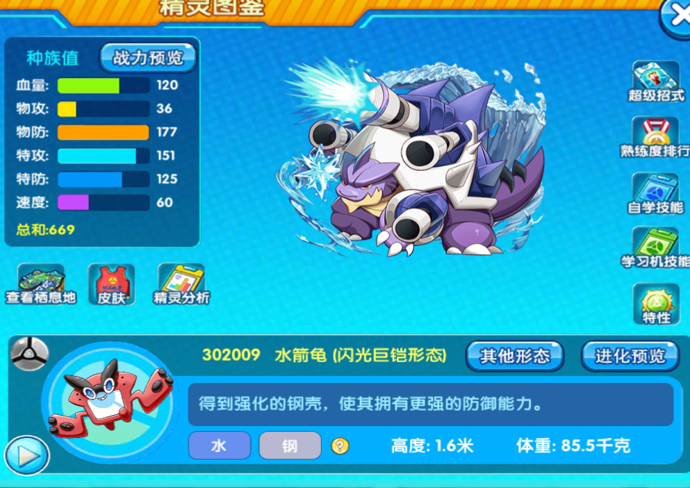 总结分析:水箭龟是比较早的一批超进化精灵,但是实力确实不如另外它的同伴喷火龙和妙蛙花,但是喜欢他的真爱玩家还是比较多的,就在几个月前,拥有了新的形态,让他从仓库从变成热门宠物,特别是闪光的,无论是中端局还是高端局,都能够看到他的身影,依靠自身优秀的属性组合,再加上优秀的技能学习面,还有不错的双方血量,让它的环境一天比一天好,哪怕是现在也有不少的高端局玩家在使用,可以说是人手一只。水箭龟新形态,拥有不错的双防,特别是物防非常的高,再加上优秀的血量,可以抵抗很多物攻手的伤害,而且拥有甲壳回复回血技能,这样就让它有一定的续航能力拥有甲壳弹射,这样的话也不怕对面的踩影精灵,而且自学高速回转,让他的定位是一个清钉手,但是特防还是偏低的,如果遇到对面的特攻手,还是要先走为上,特别是克制自己的。在最后我想说的是,水箭龟专属也是非常重要的,因为可以减免伤害,如果没有专属的话,他的能力就有可能会低一点,如果不得不要失去专属的话,也是可以的,但是要确保自身的血量足够健康才是最重要的。