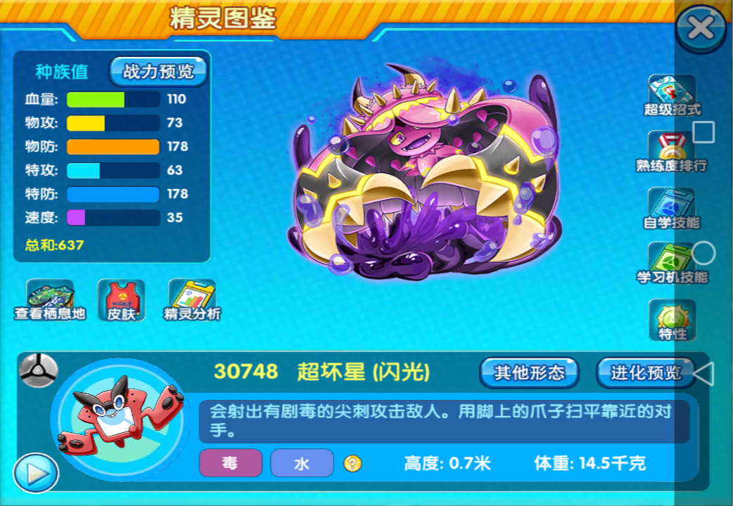 总结分析:闪光场幻星是闪光来袭,里面的精灵,可以说非常的恶心,因为他的双防非常的高,再加上拥有再生力特性,还有水加毒这种属性组合,让它可以抵抗很多的精灵,如果没有克制,根本就解决不了他,就算有克制也很难把它给解决了,哪怕他还剩一丝血,只要他有队友,那么就可以不停的切来切去,依靠再生力来回复, 所以他也是中v玩家的必选精灵之一。闪光超坏星拥有不错的双防,我在前面也说了,只要不是克制的,就很难打败他,因为它可以切来切去,而且有自我复原和再生力这两种回复效果,让他的肉度更高了,这让它的定位主要是骚扰辅助为主,那么,如何来应对他呢?最好的方法就是下钉子,然后让他上场,回不了血,这样的话,就算有再生力特性,他也回不了多少血,这样的话就能够压制他的血量,然后还有一种就是像白鬼和沙漠蜻蜓双抓组合是非常的有效果的,这也是最稳妥的一种方法,如果有些玩家没有这两个精灵的话,可以采用第一种钉子打法。在最后我想说的是超坏星这个精灵非常的肉,一般来说是不会被对面给解决的,但是你要小心对面有白鬼蜻蜓这种双抓阵容,还有钉子,只要避免这两种情况的发生,超坏星就是无敌的存在。