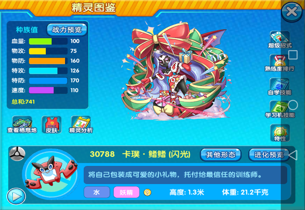 总结分析:卡噗鳍鳍也称‘77’这是玩家们给他起的别称,是阿罗拉守护神里面比较热门的一个实力也是非常的强,在游戏定位方面也是骚扰和辅助。卡普鳍鳍和白龙一样,拥有薄雾场地,所以不怕任何的异常状态,而且双防比白龙更加的优秀,可以说是一个非常不错的肉盾精灵,他的打法主要是依靠潮旋把对面抓住,然后使用自然之怒,让对面的旋量持续减少50%,然后使用束缚被动伤害来把对面抓死的这种玩法,而且拥有甲壳回复也有续航能力,所以说玩家一般是很难对付他的,因为实在是太肉了,如果想要强行解决的话,就是需要比较克制的物攻手,比如说大针蜂就是很不错的选择,还有就是上会引水特性的精灵,这样的话,对面的潮旋抓不到你,那他就没有什么办法了。在最后我想说的是,卡普鳍鳍虽然说不怕异常状态但也只有五回合,如果对面上鬼强行抓你,那你也是没有办法的只能是利用自然之怒不停地消耗当然了,也可以选择魔术外衣反一下对面的挑拨,这样的话,你就有回复的时间和回合了。