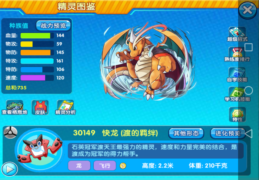 总结分析:这是快龙的羁绊形态,对比普通形态来说,让他成为了一个特攻手,这样他能比普通的更好的学习技能。并且和普通快龙一样,也能够携带专属,这就让他变成了半输出半消耗的精灵,因为专属可以提升他的肉度,而且他的这个专属多重鳞片发挥的效果必须要自身使用多重鳞片特性,才能够发挥出来,所以说,目前很多玩家都是选择了多重鳞片,而不是专属特性龙凤压,在技能方面,他主要的盲点就是水箭龟,但是带大地之力是可以打的,歇息是唯一的回复技能,冥想可以强化,再加上有专属的减伤效果,这就让它成为了半输出半辅助的定位,那么,如何反制渡的快龙呢?最好的方法就是采用四倍克制,而不是两倍克制,可以利用伤害比较高的冰属性技能,比如说激动光线,还有暴风雪、冰冻干燥,这些都是可以反制他的,如果只单单,需要两倍克制的话,那么,需要把他的血量打到半血以下就可以了,因为他的专属减伤效果只有半血以上才能够发挥,半血以下就不能够发挥了,所以可以先下岩钉让他的血量先降低一点,然后再打这样的话就没有什么问题了。在这里我想说的是,快龙对于这个专属还是十分的依靠的,如果没有专属的话,那他就直接废掉了一半,所以说,保护好他的专属是至关重要的。