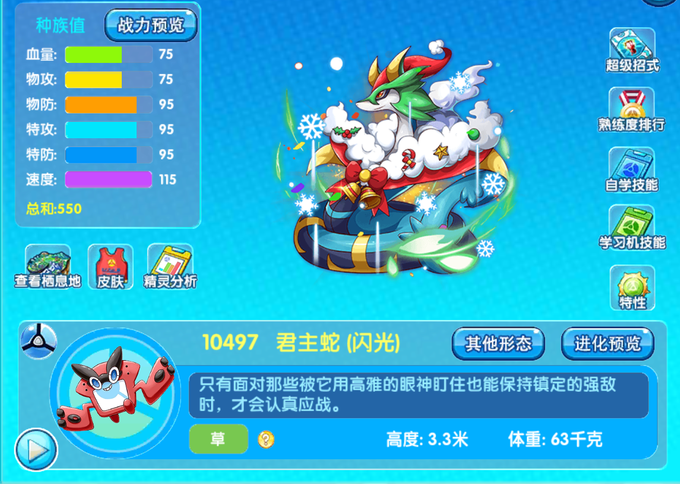 而且这个君主蛇他的闪光形态也是出了很久很久了,之前就有传言说有可能会有新的形态,但是现在好像这个传言被雪藏了一样,不知道是真是假,反正我感觉如果真的是真的,那么这个宠物它的整体能力,肯定会有非常大的改善,毕竟他有专属,而且他也是御三家