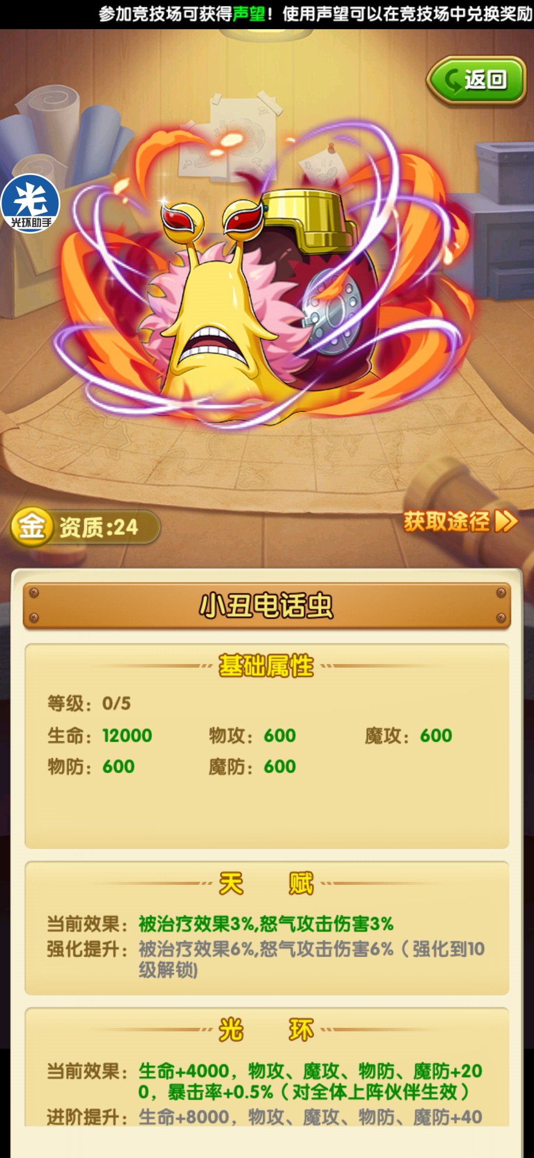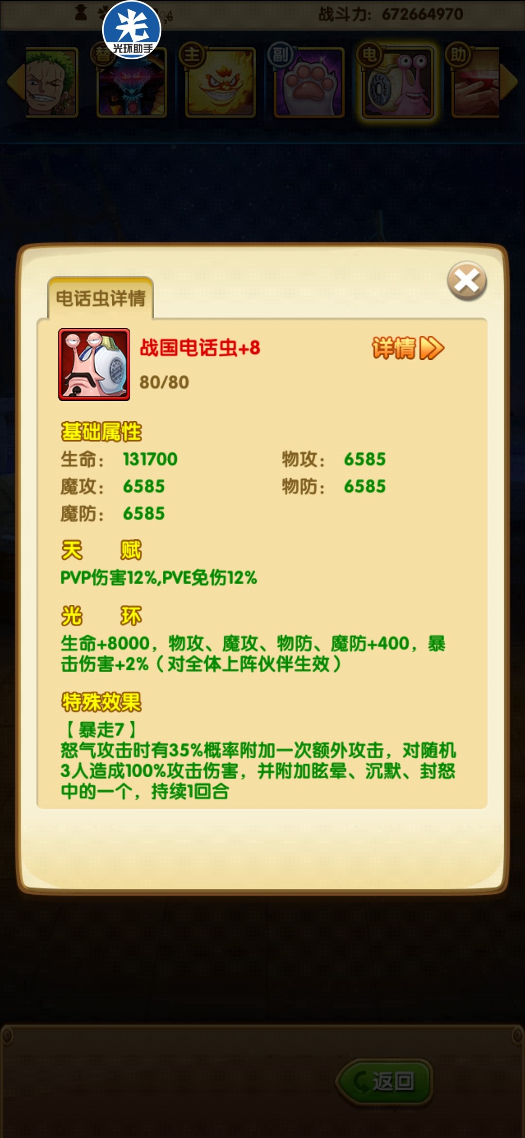 以高阶的战国电话虫(起码4至5阶)在获取PVP伤害的同时也获取一段输出与控制效果,如果有金电话虫的话放上去更好,这边推荐的金色电话虫是明哥的电话虫