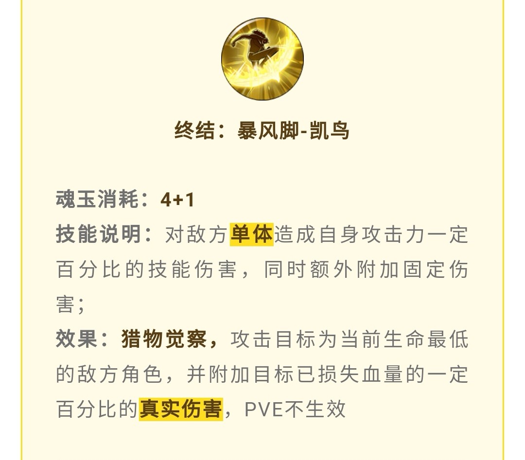 暴风脚凯鸟的攻击方式是寻找血量最少的目标来攻击,类似莫利亚,新世界乌索普之类的角色攻击方式,是可以收割残血的一个小神技,防止对方残血被突然回血导致很难减员对方。技能分析完毕,我们再来看一下爆料的三个天赋