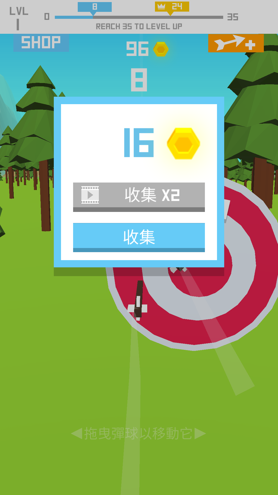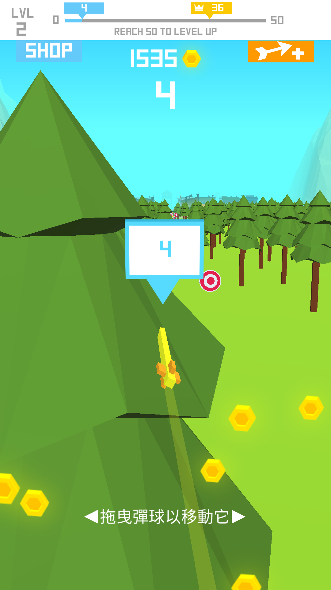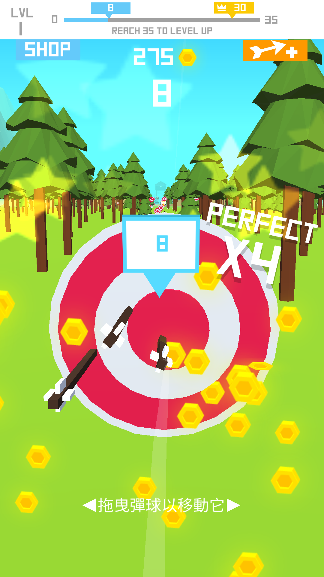 第一关玩得还不赖噢,随便一拉就打中靶子!但其实操作是有要求的,拉弓放箭之后,屏幕上弹出“拖拽弹球以移动它”,才明白,原来弓箭射出去以后,还能控制左右方向的呢!这种玩法还是比较新鲜,当然我们就不要考虑为什么弓箭射出去以后还能操控方向啦,毕竟游戏嘛。