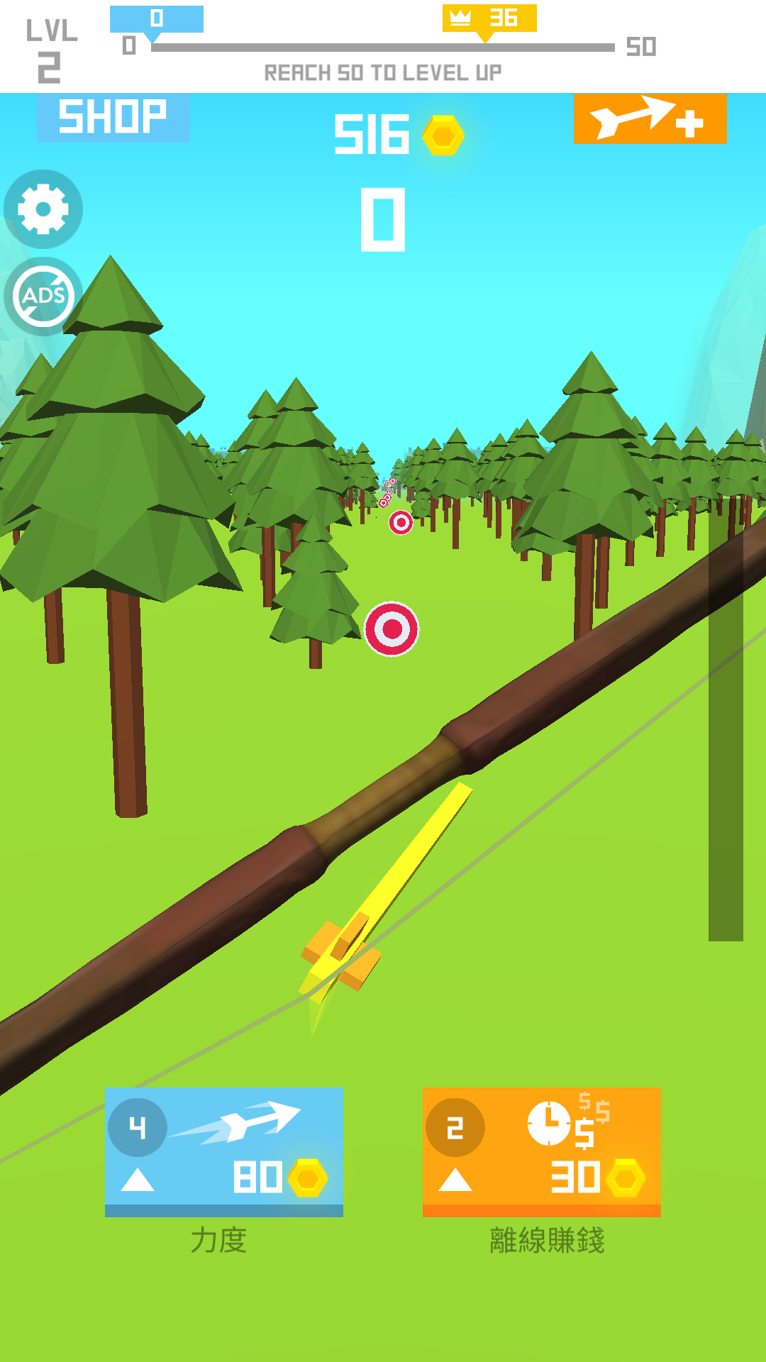每个关卡结束后,玩家可收集金币,离线也会有金币加成,屏幕上方有升级进度条,升级后将解锁新武器,弓和箭的款式多种多样,我们慢慢来解锁。