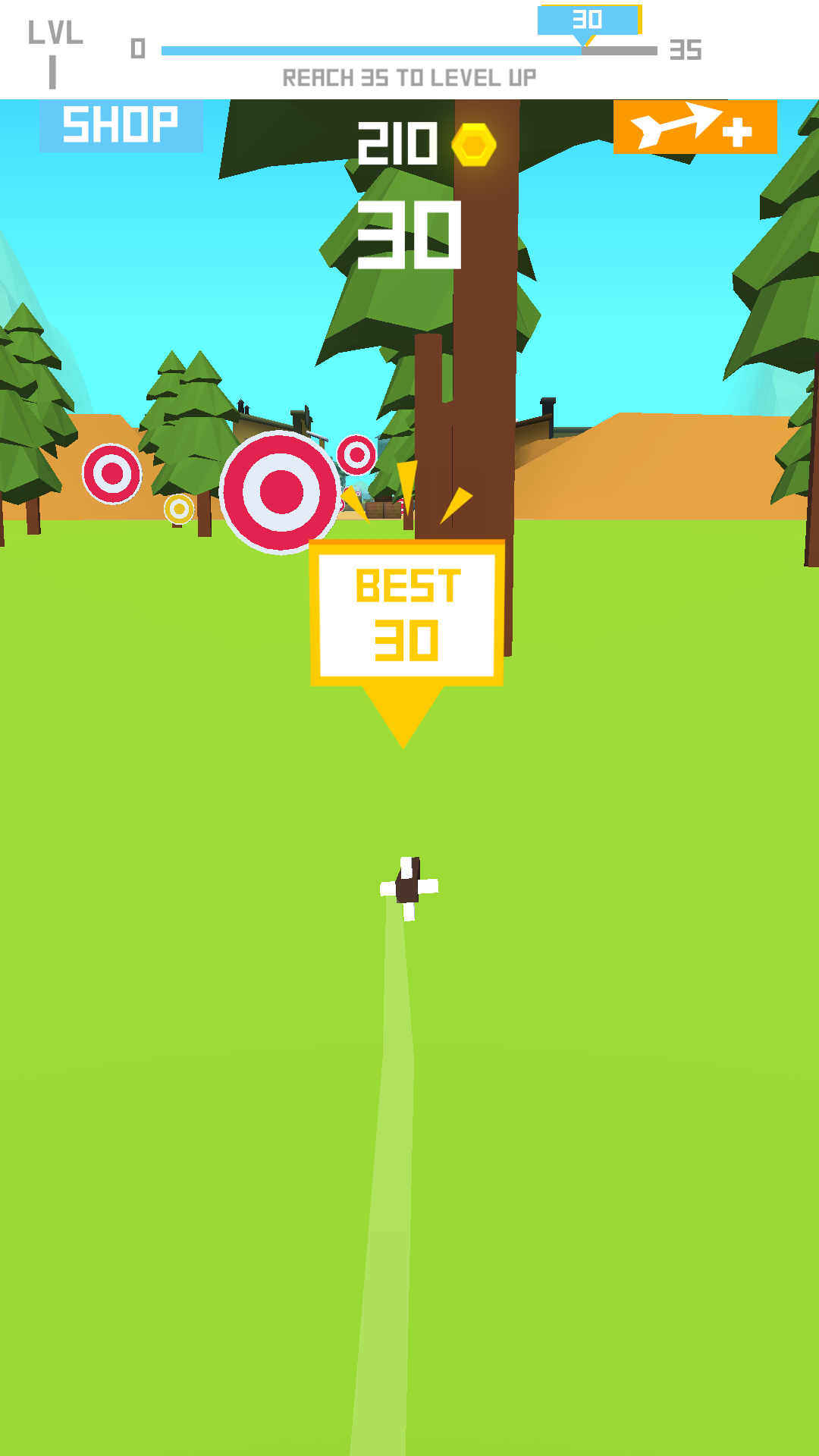 《飞箭》的主要操作就是拉弓蓄力,拖动弓箭时,右边会有一条蓄力条,松开屏幕弓箭就会飞出去了。此时,玩家通过滑动屏幕控制弓箭方向,选择目的地,如果控制不好,就会扎在树上咯。打中靶子的话,将会获得金币奖励,中靶可以翻倍,越靠近中心会有越高的分值,如果打中靶心不知会怎么样呢?飞得越远,风景也会相对不同,昭君尝试了几次,都没能开拓新视野……各位高手一起来挑战下。