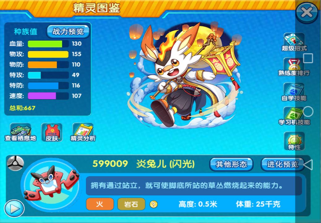 总结分析:闪光炎兔儿是新一代御三家第一只登场的精灵,外形上面很符合中秋节,在种族值方面,速度不是特别的优秀,但是血量和物攻是比较够看的,而且它是岩石属性的精灵,大家都知道岩石属性的精灵可以在,沙流天气下能够拥有50%的特防加成,所以说,这让他在特防方面会比较高,但是需要天气的帮助,所以说,化石翼龙是一个比较好的队友。在弱点方面上面有两个四倍弱分别是地上和水,而且这两种属性又是当下比较热门的,所以说,小兔子的对手,或者是说天敌还真的是挺多的,所以说,在队友方面,我就给他搭配了乐天河童。